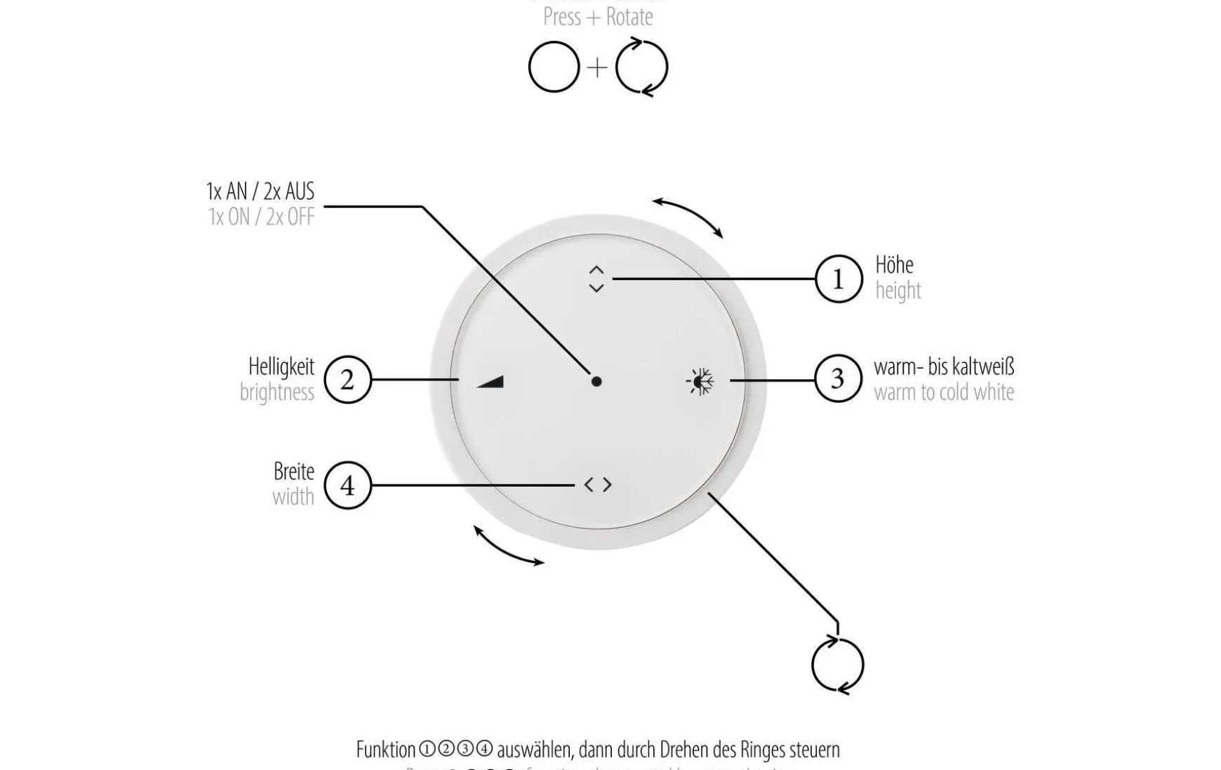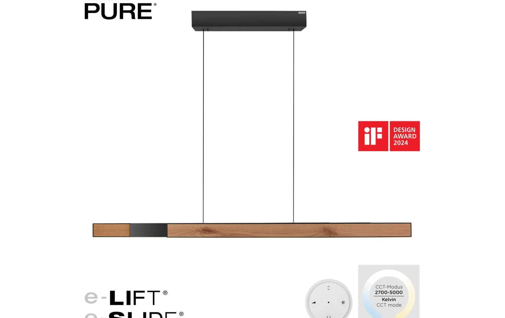 Perfekte Form, perfekte Oberfläche, perfekte Funktion – die Eiche-Naturfarbene LED Pendelleuchte überzeugt mit einer funktionellen Vollkommenheit und lässt kaum noch Wünsche offen. Die ästhetische Pendelleuchte verfügt über einen e-SLIDE® und e-LIFT® motorisierten Antrieb. Diese Funktionen ermöglichen eine elektrische Höhenverstellung sowie eine elektrische Längenverstellung. So fügt sich die Pendelleuchte perfekt den persönlichen Anforderungen und Anlässen ein. Wie von Zauberhand kann man über die neu entwickelte runde Fernbedienung per umlaufenden Einstellring die entsprechenden Steuerbefehle umsetzen. Die magnetische Fernbedienung kann mittels beiliegenden Wandhalter auch in die gebräuchlichsten Lichtschaltersysteme integriert werden. Die Pendelleuchte verfügt über eine CCT-Farbtemperatursteuerung, die es ermöglicht die Lichtfarbe von einem warmweißen Licht (2700K) bis zu einem tageslichtweißen Licht (5000K) zu verändern. Die Farbsteuerung schafft eine perfekte Grundlage für Ihren Lebensalltag. Es unterstützt die emotionalen Bedürfnisse sowie der biologische Uhr. Dies kann sich positiv auf Ihr Wohlbefinden auswirken sowie die Leistungs- und Aufnahmefähigkeit ankurbeln. Zusätzlich kann man die Lichtintensität ganz unkompliziert dem Tageslicht oder Wünschen anpassen. So steht den persönlichen Bedürfnissen fast nichts mehr im Weg. Auf die zuletzt gewählte Lichteinstellung greift die Pendelleuchte dank Memory-Funktion immer wieder zurück. Schaffen Sie sich Ihre eigens kreierte, persönliche Wohlfühlatmosphäre über Ihren Esstisch. Auf der Oberseite der Pendelleuchte befinden sich vier Touchflächen, über die man durch Berührung die Lichtfarbe und Lichtintensität regulieren, die Länge ein- oder ausfahren sowie die Leuchte ein- und ausschalten kann.