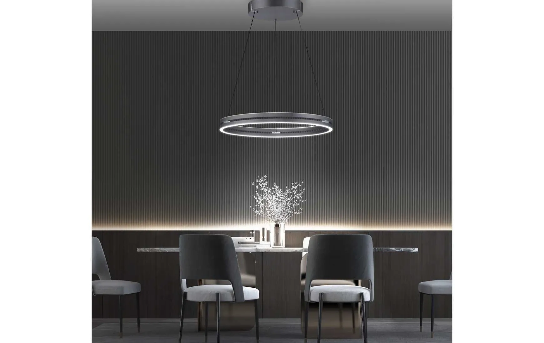 Diese Pendelleuchte verfügt über einen motorisierten Aufzug, der die Leuchte über die mitgelieferte Fernbedienung stufenlos von 60 auf 240 cm in die Höhe heben kann. Sie können auch alle Funktionen der Lampe mit derselben Fernbedienung steuern – LED-Licht sowohl an der Ober- als auch an der Unterseite der Lampe. Sie verfügt über eine einstellbare Dimmung, bei der die Lichtfarbe zwischen 2700 und 5000 Kevin geändert werden kann.