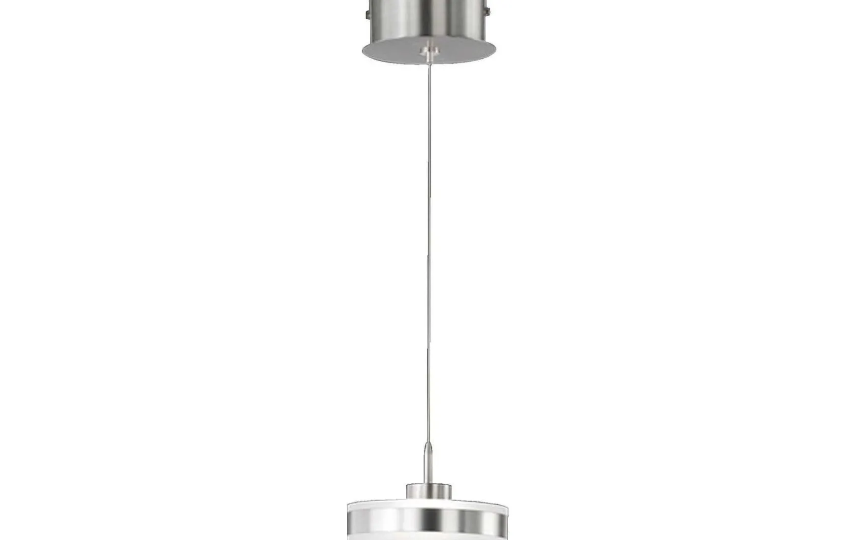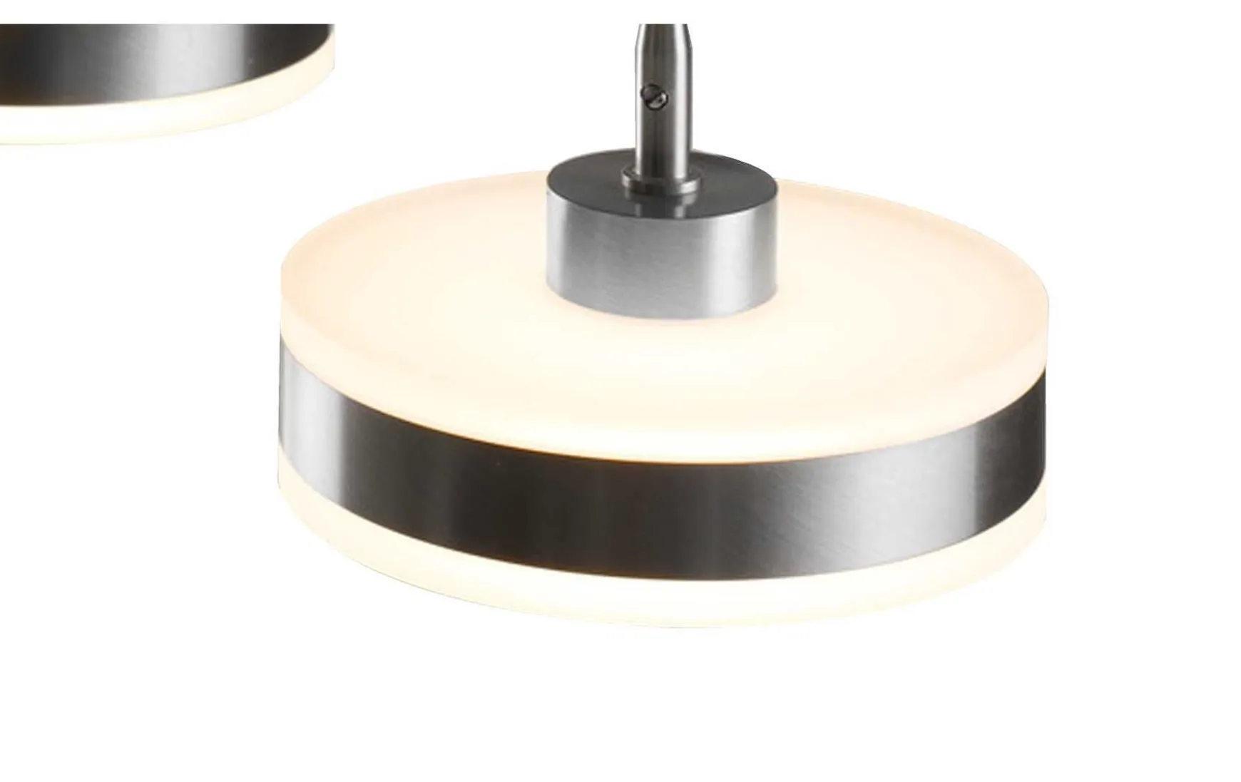 An dem Kabel der Leiste in Nickel matt, die Sie direkt an der Decke anbringen, hängt eine kreisrunde sowie flache Leuchte.