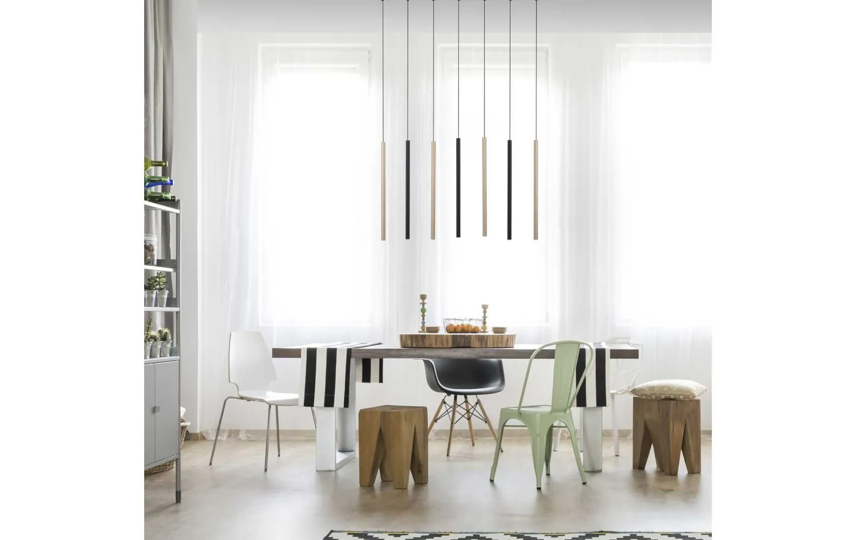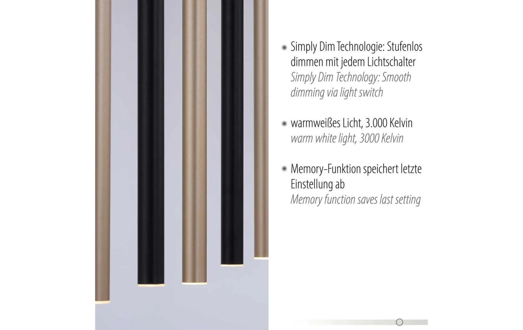 Diese LED Pendelleuchte fügt sich mit einem minimalistischen Erscheinungsbild gekonnt in Ihrem Wohnumfeld ein. Von dem schwarzen Deckenkasten hängen sieben einzelne, filigrane Leuchtrohre in gebürsteten Schwarz und in Gold herunter, die jeweils mit einem warmweißen LED Leuchtmittel bestückt sind. Die Hängelampe ist mit einer stufenlosen Dimmer-Technologie „simply dim“ ausgestattet. Durch Simply dim ist es möglich über einen vorhandenen Lichtschalter, ganz egal ob Kipp-, Zug-, Schnur- oder Wandschalter die Leuchte zu dimmen, ohne einen zusätzlichen Dimmer zu verwenden. Die Dimmer-Technologie steuert die Helligkeit über den Schaltimpuls und so kann die Leuchte von 100% bis runter auf 10% der Lichtintensität stufenlos gedimmt werden. Wird die Leuchte weniger als 3 sec. nach dem Ausschalten wieder angeschaltet, startet der Dimmvorgang. Hat sie den hellsten (100%) bzw. dunkelsten Wert (10%) erreicht, verweilt sie ca. 2 sec. auf dieser Einstellung, um den Vorgang abermals zu starten. Erstrahlt die Leuchte während eines Vorgangs in der gewünschten Helligkeit, kann man durch Ausschalten der Leuchte die Lichtintensität abspeichern. Schaltet man die Leuchte nun wieder an, scheint die Leuchte in der gespeicherten Helligkeit und diese Einstellung bleibt so lange erhalten bis man eine erneute Änderung vornimmt. Die Pendelleuchte wird zu einem echten Hingucker über Ihren Esstisch.
