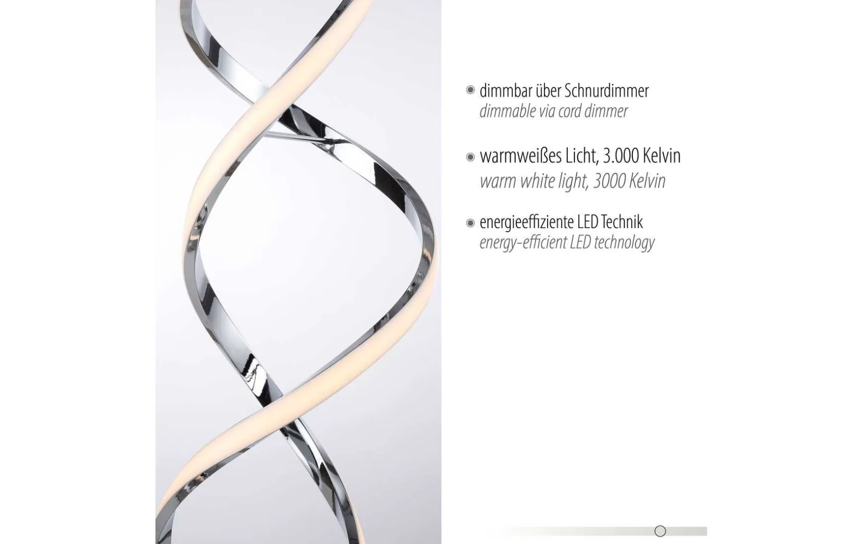 Diese LED Stehleuchte vereint modernes Design mit dekorativen Charme. Mit ihrer glänzenden Chromoberfläche und dem satinierten Glascover ist sie ein wahrer Blickfang in jedem Raum. Egal ob im Wohnzimmer, Schlafzimmer oder Büro, die Leuchte fügt sich perfekt in jeden Einrichtungsstil ein. Durch den integrierten Schnurdimmer lässt sich die Helligkeit individuell anpassen, um eine gemütliche Atmosphäre zu schaffen. Das LED Leuchtmittel mit einer Farbtemperatur von 3000K sorgt für eine warmweiße Beleuchtung, die das Raumklima positiv beeinflusst. Das satinierte Glascover gibt ein angenehmes und blendfreies Licht wieder. Die vielseitigen Einsatzmöglichkeiten von der Stehleuchte machen sie zu einem unverzichtbaren Accessoire in Ihrem Zuhause. Ob als gemütliche Leseleuchte neben dem Sofa oder als stilvolle Beleuchtung für den Arbeitsplatz, die geschwungene Stehleuchte findet schnell einen geeigneten Platz.