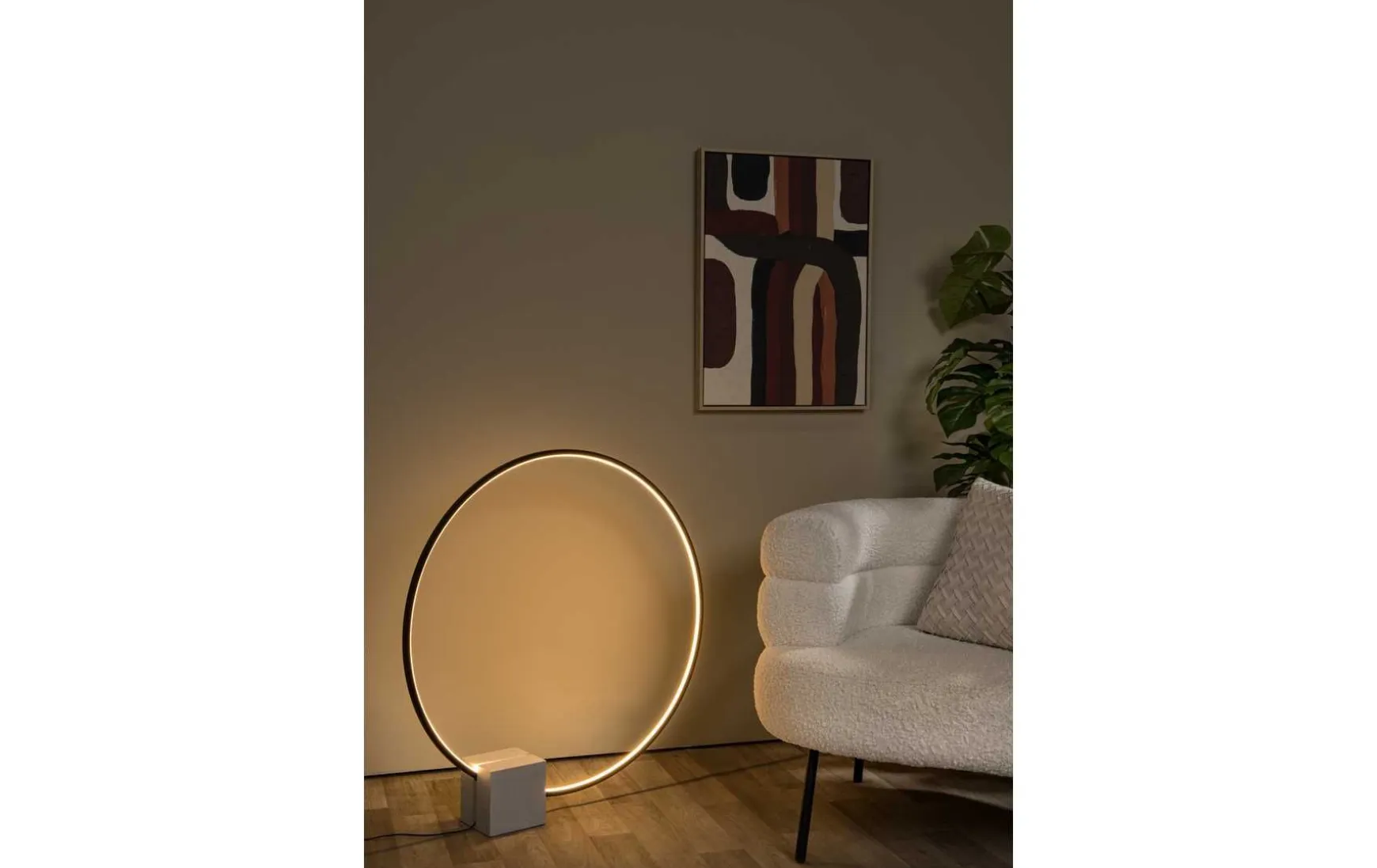 Die kreisförmige Lampe – wie der Name schon sagt – kombiniert spielerisch einen quadratischen Sockel.