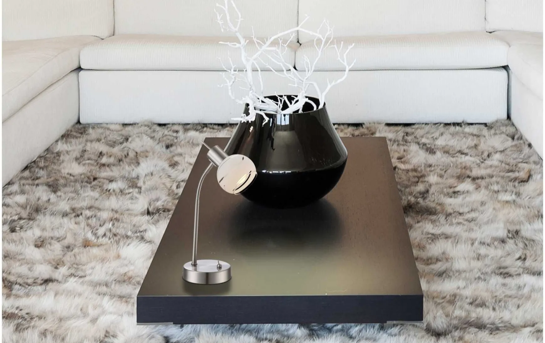 Diese Tischleuchte in moderner Nickel-Optik mit satinierter Glaskugel als Schirm passt sich zahlreichen Einrichtungsstilen problemlos an.