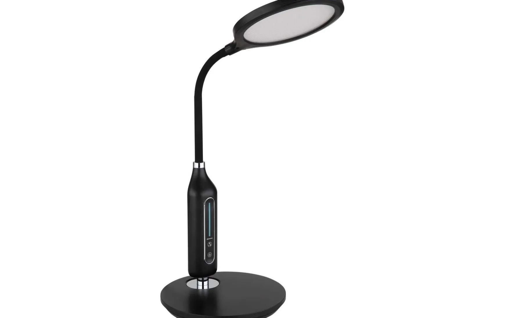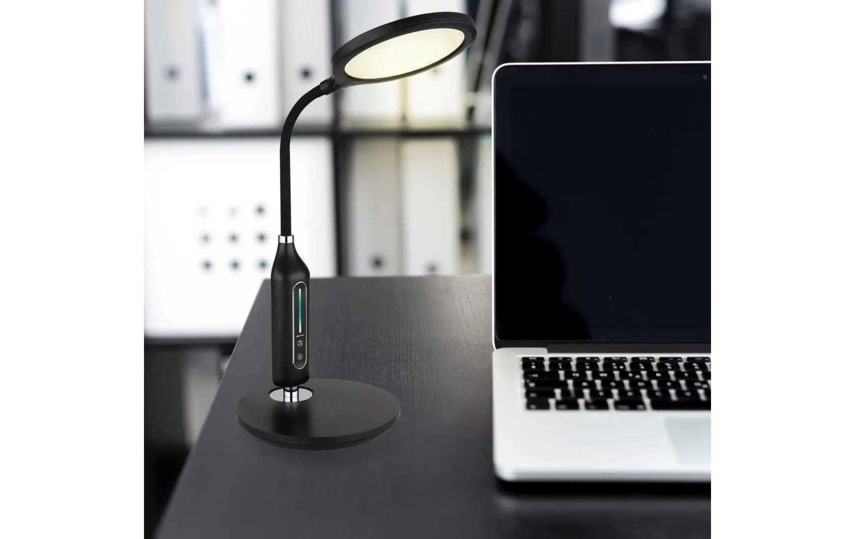 Tischleuchte Kunststoff schwarz matt, Chrom, Kunststoff satiniert, Silikon schwarz matt, Kabel PVC Schwarz, Touch Ein/Aus, dimmbar, stufenloser Touchdimmer, Farben fixierbar, Memoryfunktion, Adapter inkl., Flexo, LxBxH: 300x185x407mm, Kabellänge 1300mm, inkl. LED 9W 230V, 22-800lm Source, 8-530lm Output, CCT 3000/4000/6500K