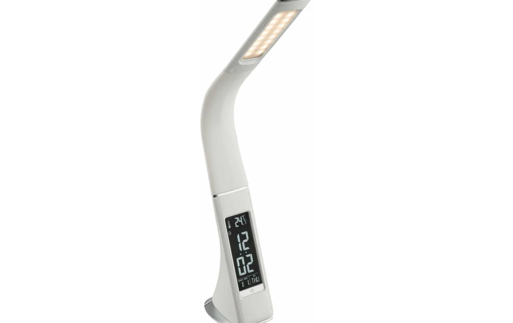 Aus verchromten Metall und weißem Kunststoff hergestellt, bietet sie neben der Möglichkeit einer Verstellung der Lichtfarbe (Kelvin) des flexiblen Lampenarms auch ein Display, auf dem Uhrzeit, Kalender und Raumtemperatur angezeigt wird.