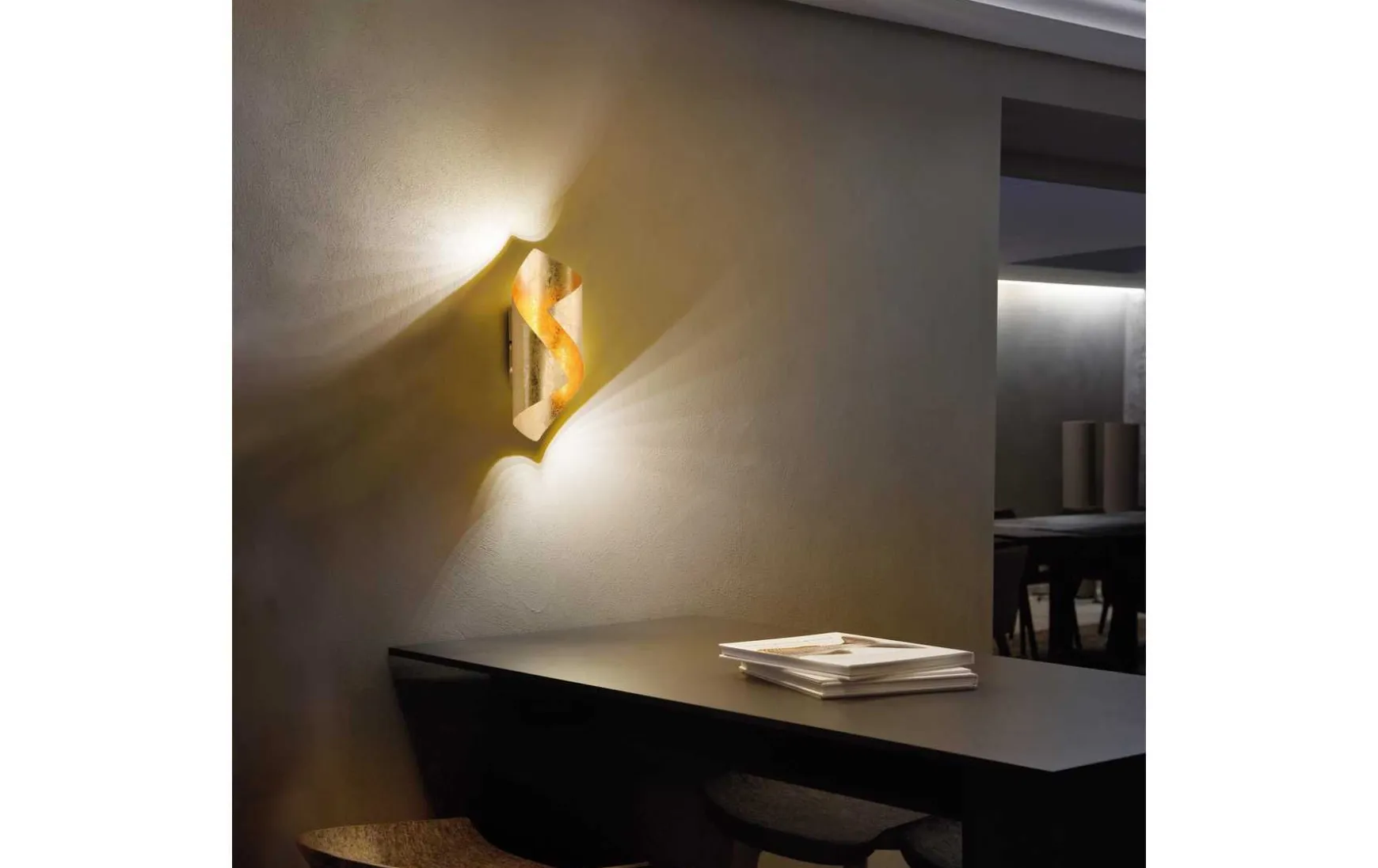 Die aus Stahl gefertigte LED Wandleuchte wirkt durch die blattgoldfarbige Lackierung besonders edel.