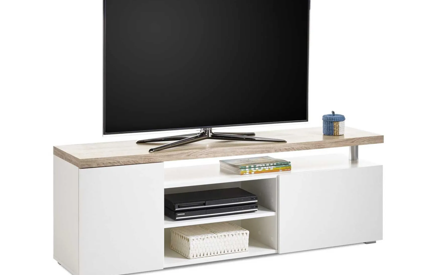 Durch das außergewöhnliche Design in Weiß mit einem Oberboden in Eiche Sonoma wird dieses Lowboard zum Blickfang in jedem Wohnzimmer. Als besonderes Highlight sticht das offene Fach sofort hervor und zusammen mit den 2 grifflosen Türen mit „push-to-open“ Funktion bietet diese Kommode viel Stauraum. Die beiden Nischen eignen sich zudem ideal zur Unterbringung Ihrer Mediengeräte.