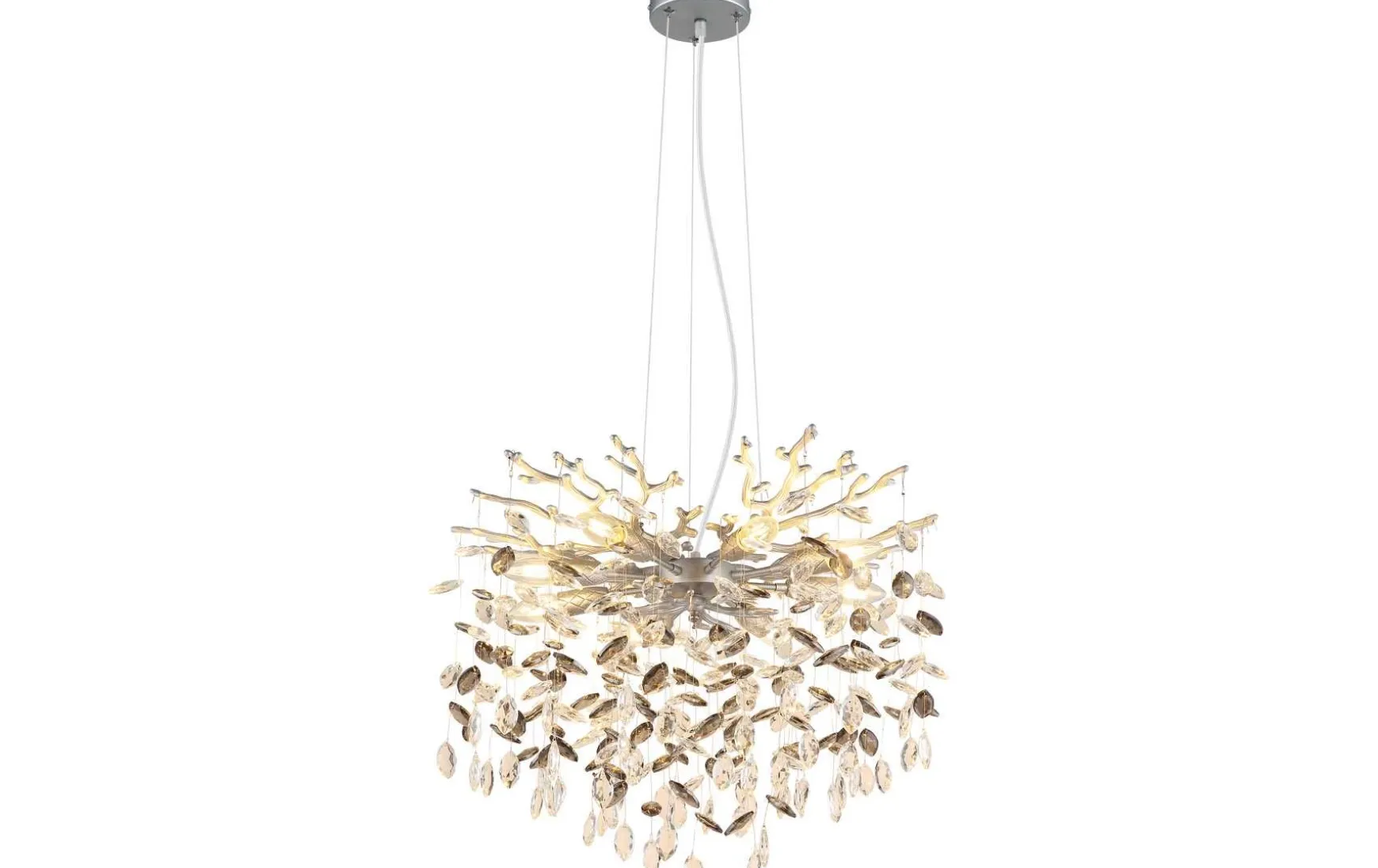Veredelt wird das Design durch hochwertige Glaskristalle in Rauchgrau und Klar, die das Licht effektvoll brechen und für stimmungsvolle Reflexe sorgen.
