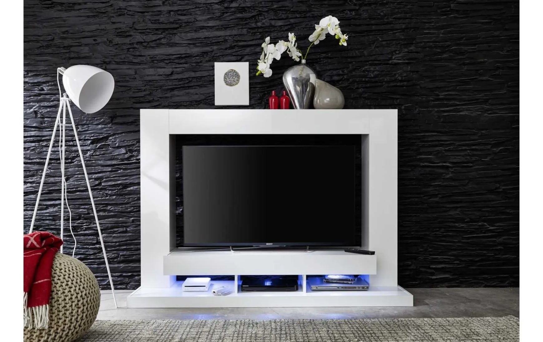 Die Mediawand ist ein modernes und stilvolles Möbelstück, das mit einem jungen Design und hochwertiger Verarbeitung überzeugt. Die Wand kombiniert praktische Funktionen mit ästhetischem Flair und ist ideal für das Wohnzimmer oder andere Wohnräume geeignet. LED-Unterbauspot mit Farbwechsellicht: Die Mediawand verfügt über integrierte LED-Leuchten mit Farbwechsel-Option, die das Ambiente nach Belieben anpassen. Ideal für eine stimmungsvolle Beleuchtung, die sich je nach Bedarf von warmem Licht zu kühleren Tönen verändern lässt.