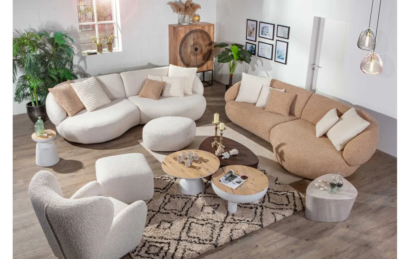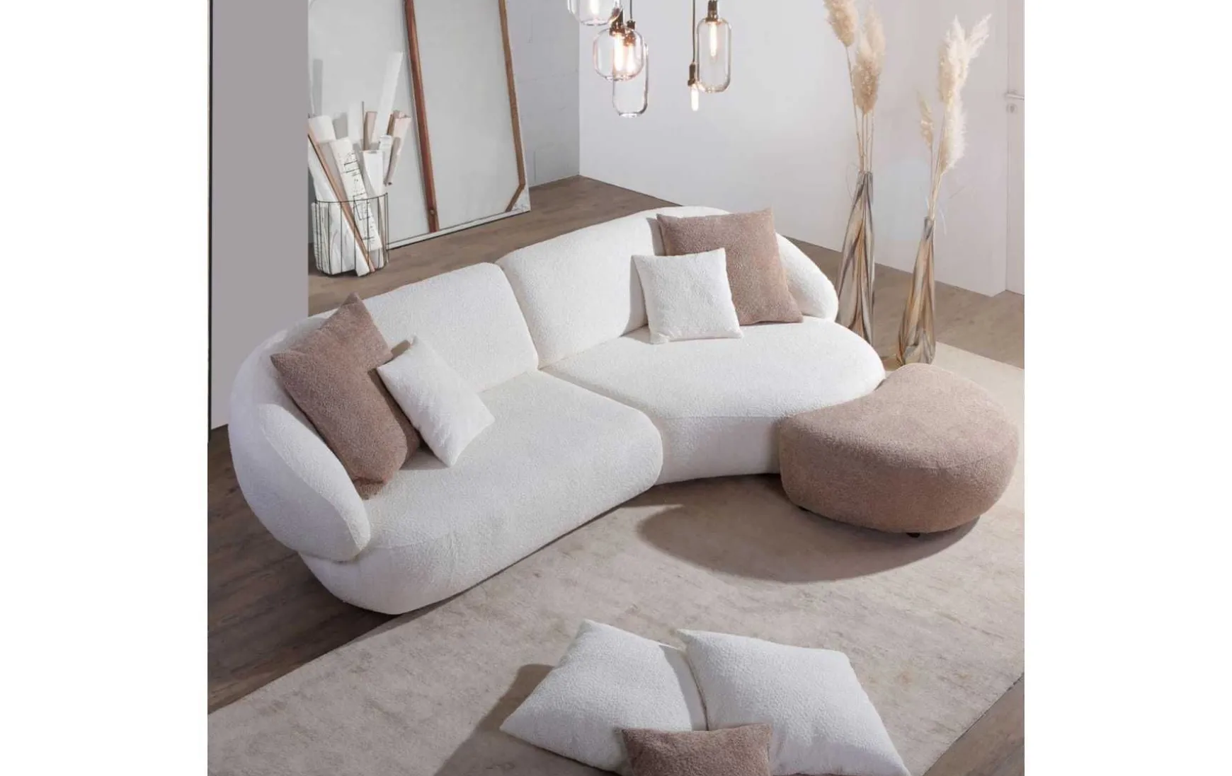 Dieses Megasofa XL ist eine trendige Wohnlandschaft, die Gemütlichkeit und modernes Design perfekt vereint. Der kuschlige und weiche Bouclé-Stoff verleiht dem Sofa eine besonders behagliche Ausstrahlung. Mit einer chilligen Sitztiefe bietet es eine entspannte Sitzgelegenheit für gemütliche Stunden. Das Megasofa wird inklusive 2 Rückenkissen und 2 kleinen Kissen geliefert, um das Wohlfühlerlebnis zu komplettieren. Das stabile Grundgestell aus Holz gewährleistet eine zuverlässige Stabilität, während die schwarzen Füße aus Kunststoff dem Sofa einen modernen Akzent verleihen. Mit einem großzügigen Stellmaß von ca. 300 x 80 x 140 cm (wahlweise mit der Rundung rechts oder links) bietet das Megasofa ausreichend Platz zum Relaxen. Die Sitzhöhe beträgt 42 cm, und der Rücken ist echt bezogen, was dem Möbelstück eine hochwertige Optik verleiht. Das Megasofa XL schafft einen stilvollen und gemütlichen Rückzugsort in Ihrem Wohnraum.