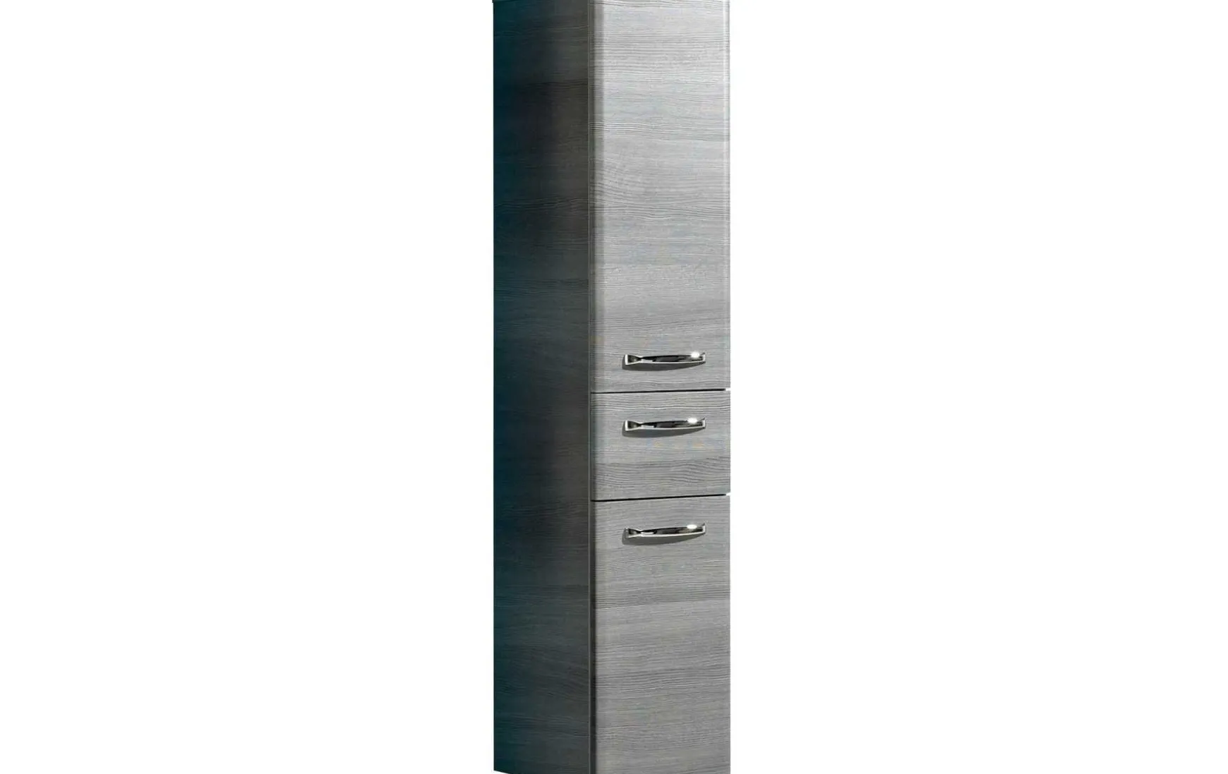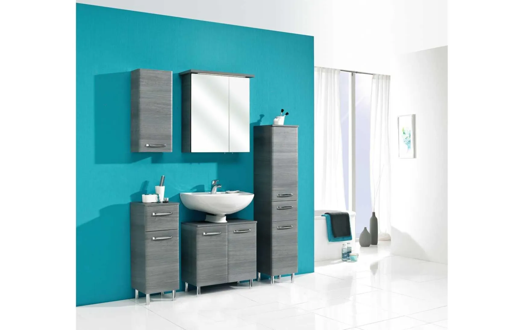 Dieser moderne Midischrank überzeugt durch sein elegantes Graphit-Design mit markanter Querstruktur und setzt stilvolle Akzente im Badezimmer. Die Bügelgriffe in Chrom-Glanz unterstreichen die hochwertige Optik und sorgen für ein harmonisches Gesamtbild. Dank der schlanken Form eignet sich der Schrank ideal für kleine bis mittelgroße Räume.