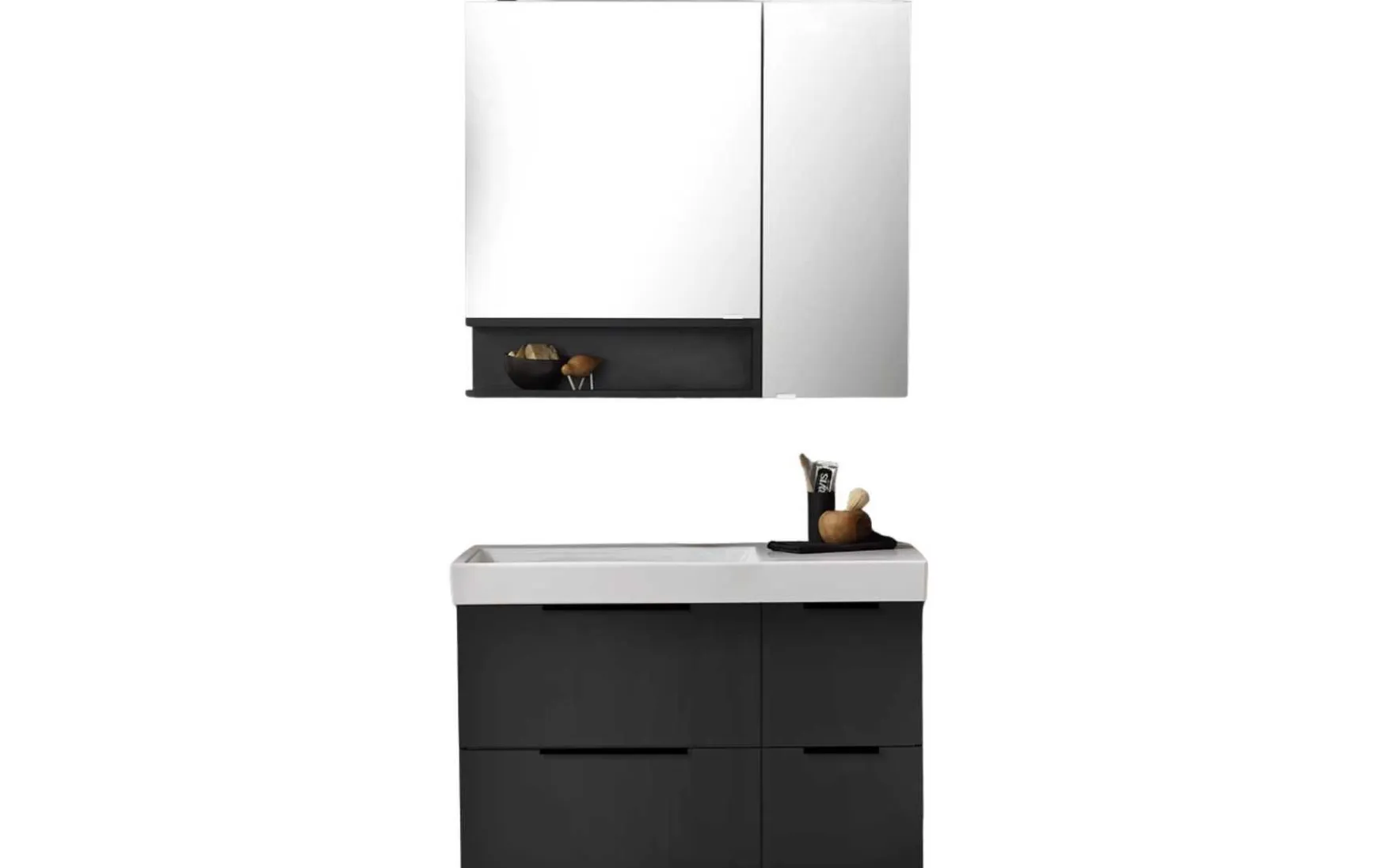 Der Spiegelschrank verfügt über eine Doppelspiegeltür und ein bündiges Regal, das links offen ist (Maße: ca. 60 × 80 × 15 cm), und bietet zusätzlichen Stauraum für Badutensilien. Abgerundet wird die Ausstattung durch eine LED-Aufbauleuchte in mattem Schwarz, die für angenehmes Licht sorgt. Die Gesamtbreite der Kombination beträgt ca. 90 cm, wodurch sie platzsparend und zugleich funktional ist.