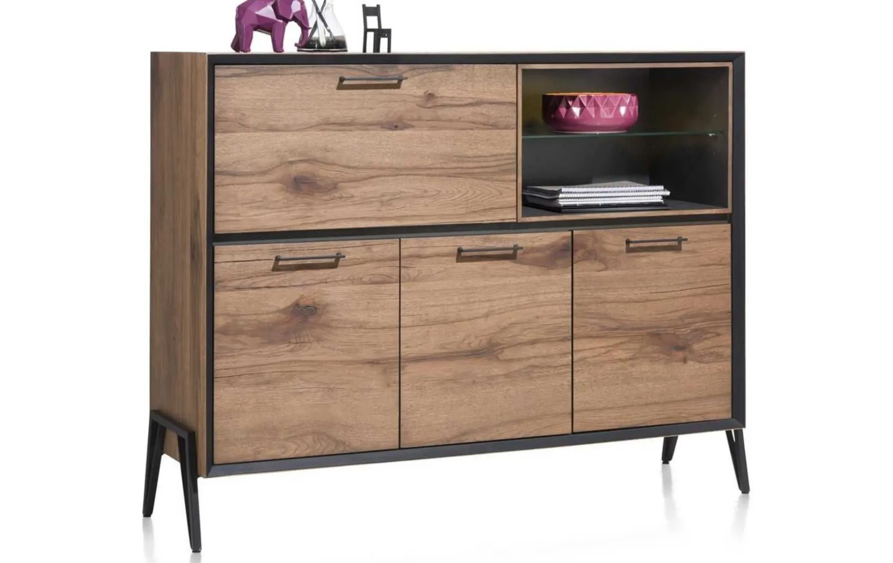 Wenn Sie Platz für ein Sideboard haben, verwandelt diese Dresette Ihren Wohnraum in ein Home Office. Sie erhalten den gleichen Stauraum wie bei einem 3-türigen Sideboard, aber oben auf der Dresette befindet sich eine herunterklappbare Frontpartie, die die Dresette in einen Schreibtisch verwandelt.