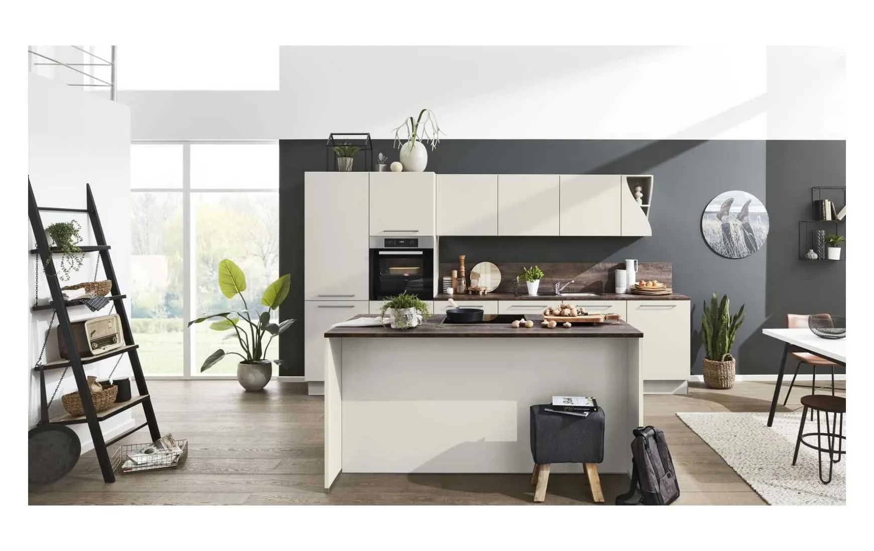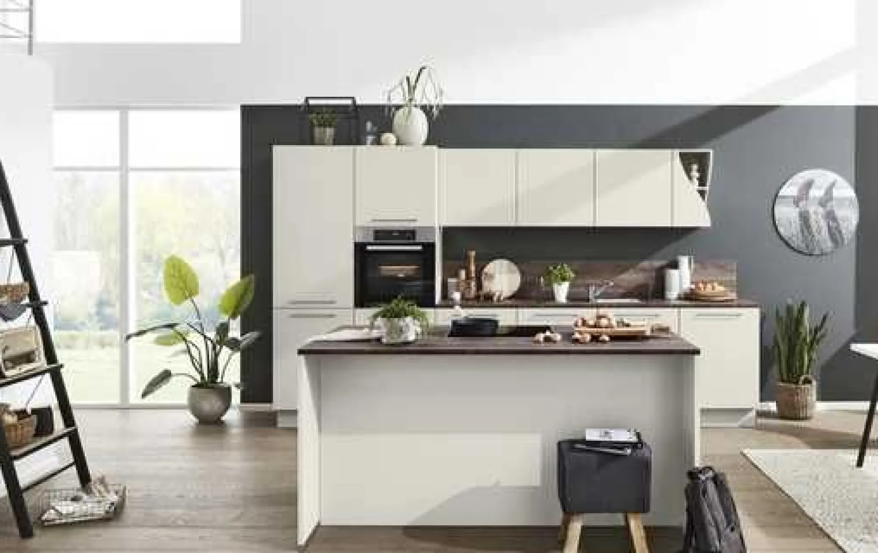 - Gegen Mehrpreis erhältlich: Elektrogeräte, Wandregal, Einbauspüle und Armatur