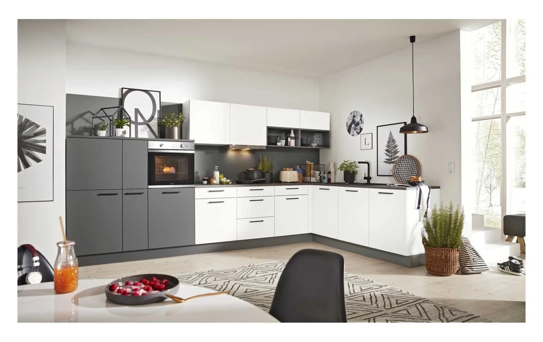 Topmoderne Einbauküche in Echtlack platingrau softmatt kombiniert mit Arbeitsplatten in Eiche Barrique Nachbildung, ca. 360+180cm. Elektrogeräte, Wandregal, Einbauspüle und Armatur gegen Mehrpreis. Andere Größen und Zusammenstellungen zum individuellen Preis planbar.