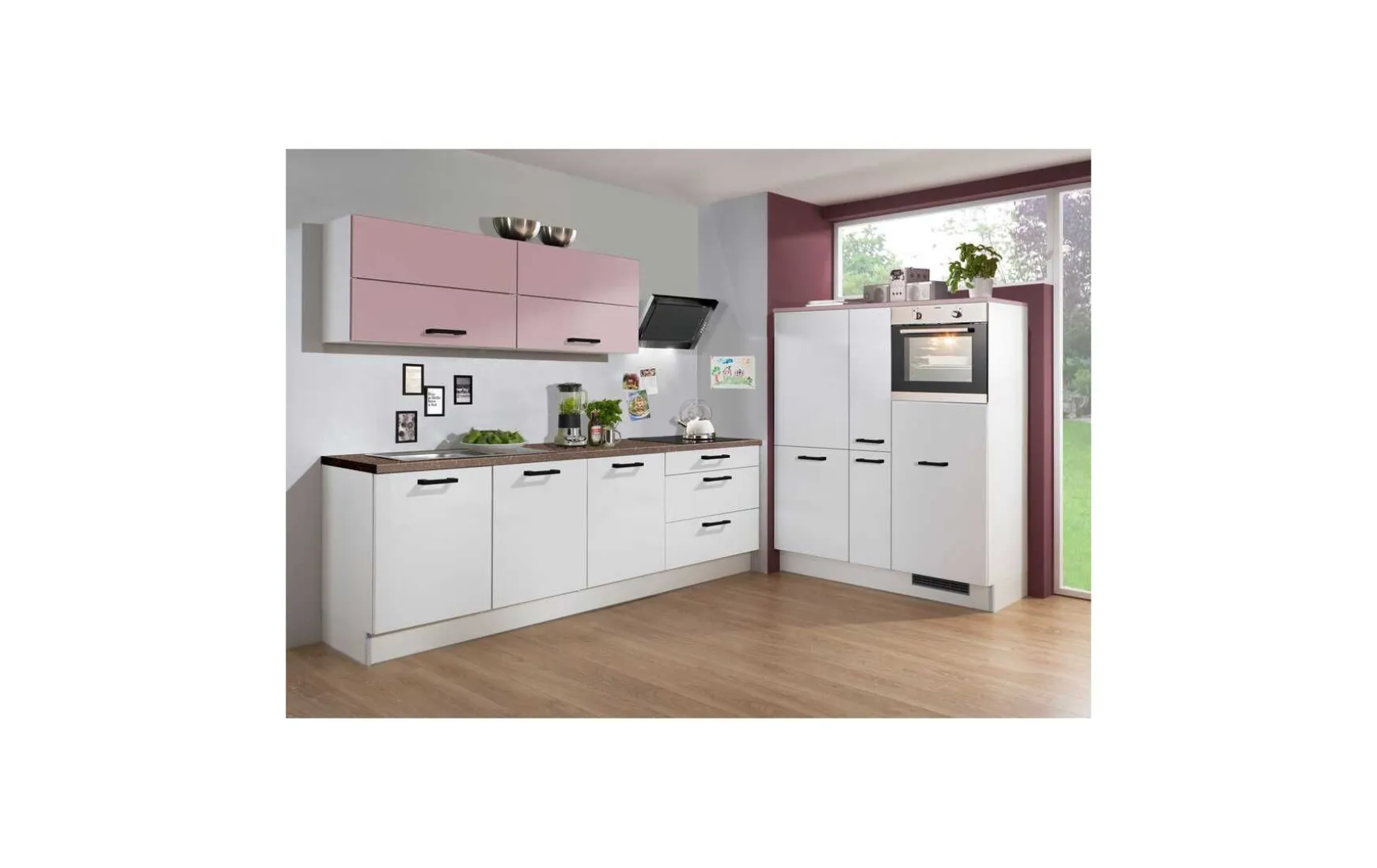 Topmoderne Einbauküche in weiß kombiniert mit antikrosa, ca. 270+150cm, inkl. Elektrogeräte-Set. Geschirrspüler, Einbauspüle und Armatur gegen Mehrpreis. Andere Größen und Zusammenstellungen zum individuellen Preis planbar.
