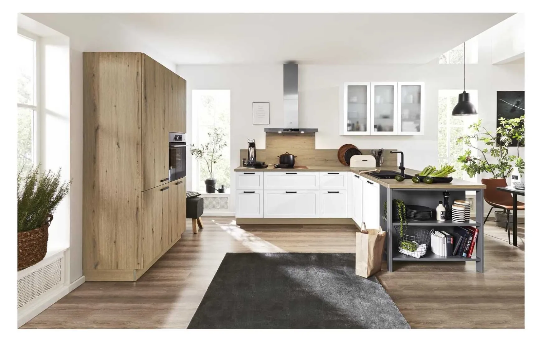 Moderne Landhausküche in 3D-Lacklaminat weiss matt kombiniert mit offenem Abschlussregal in quarzgrau und Vulkaneiche Nachbildung, ca. 120+318x217cm. Elektrogeräte, Hocker, Sessel, Nischenpaneele, Einbauspüle und Armatur gegen Mehrpreis. Andere Größen und Zusammenstellungen zum individuellen Preis planbar.