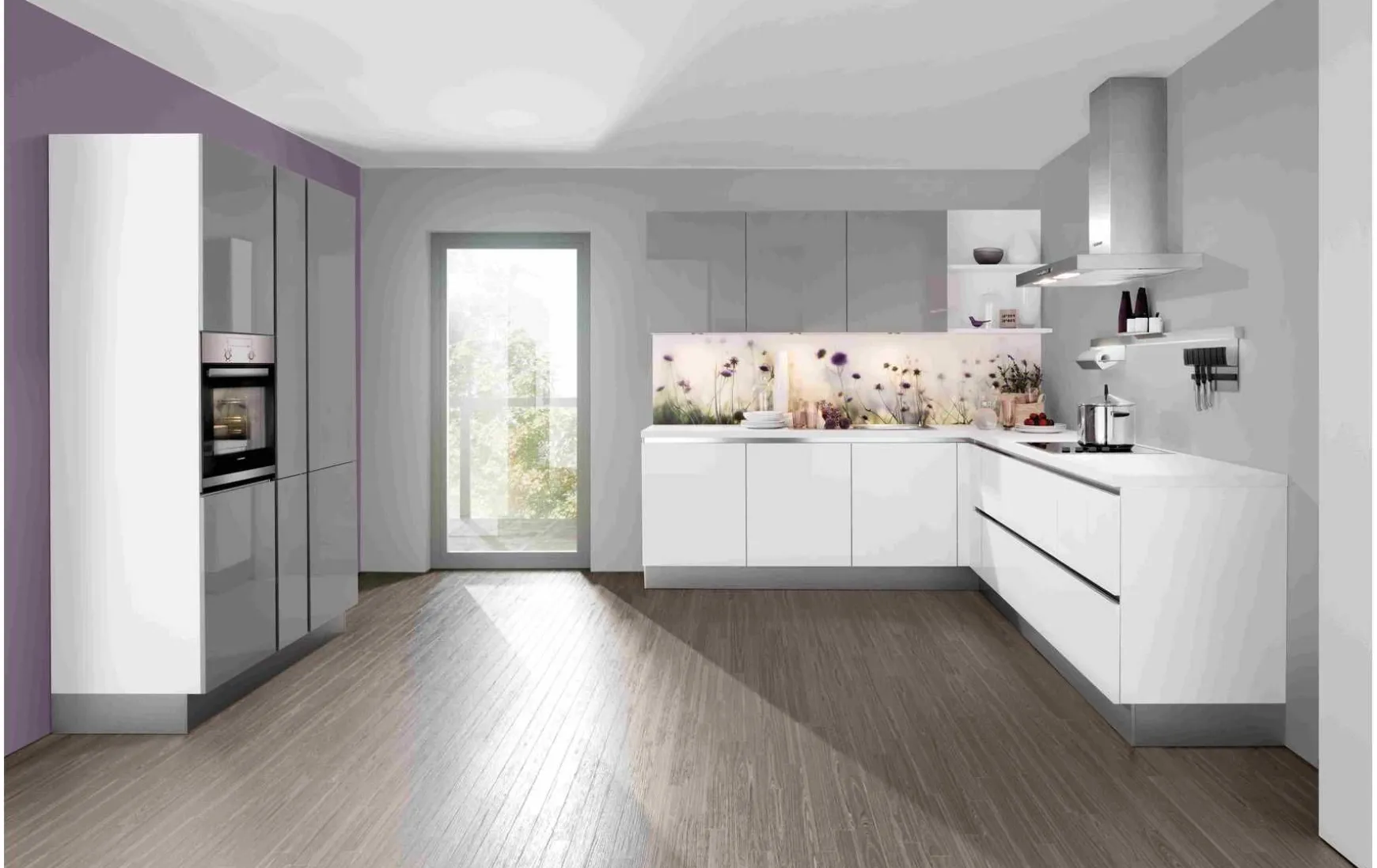 Moderne Einbauküche in Lack weiß Hochglanz mit Hängeschränken in Absetzfarbe grau ca. 245×274+155 cm inkl. Elektrogeräte-Set und Einbauspüle. Geschirrspüler, Nischenrückwand, Utensilienwandboard und Beleuchtung gegen Mehrpreis. Andere Farben, Größen und Zusammenstellungen zum individuellen Preis planbar.