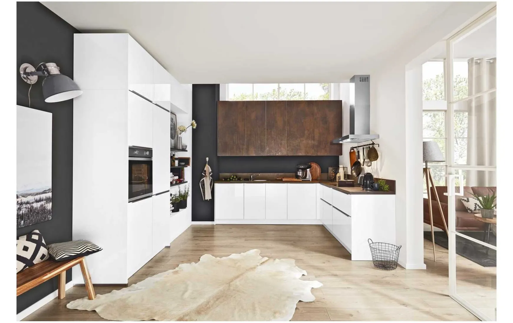 Topmoderne Einbauküche in weiß Hochglanz kombiniert mit Hängeschränke und Arbeitsplatten in Kupfer Oxid Nachbildung, ca. 123+277x245cm. Elektrogeräte, Einbauspüle und Armatur gegen Mehrpreis. Andere Größen und Zusammenstellungen zum individuellen Preis planbar.