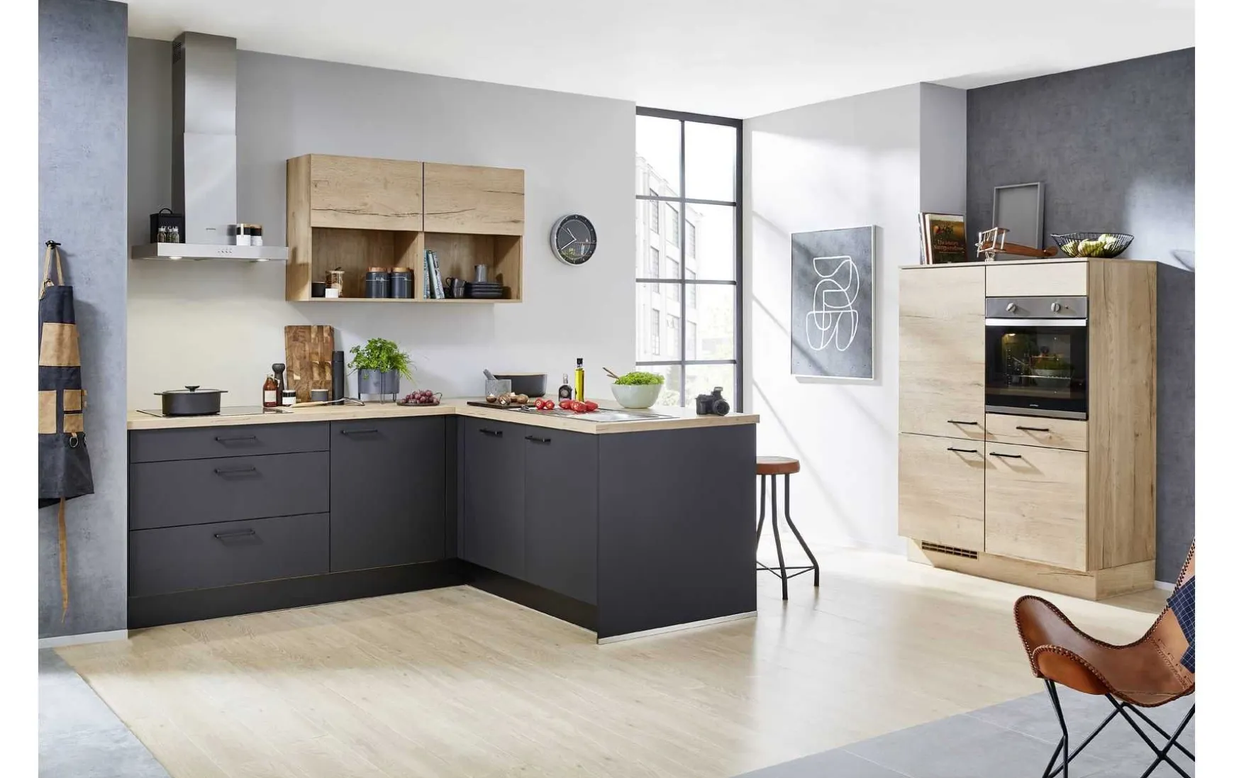 Moderne Einbauküche in Lacklaminat grafitschwarz matt mit Anti-Fingerprint Oberfläche kombiniert mit Eiche San Remo NB, ca. 210×220+120cm, inkl. Elektrogeräte-Set und Einbauspüle. Geschirrspüler, Hocker und Armatur gegen Mehrpreis. Andere Größen und Farben zum individuellen Preis planbar.