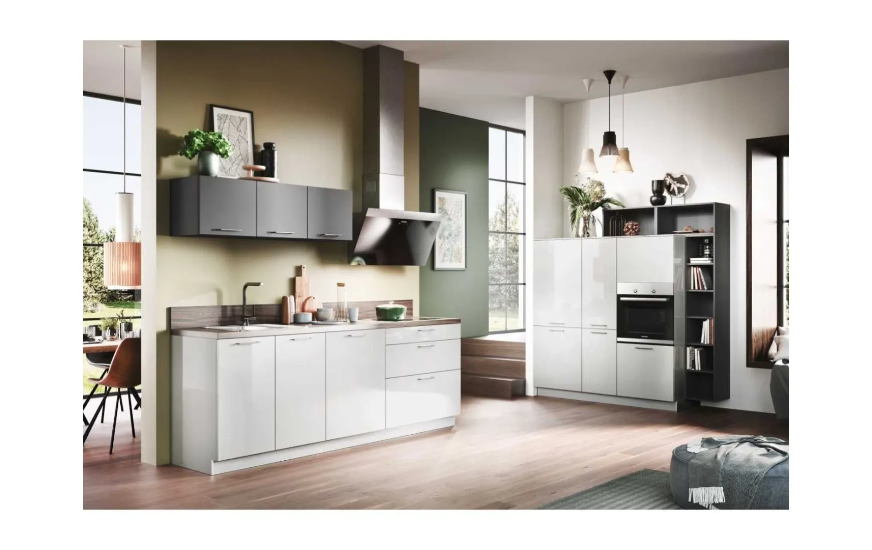 Topmoderne Einbauküche in satin Hochglanz kombiniert mit graphit ultramatt, ca.400+160cm, inkl. Elektrogeräte-Set. Geschirrspüler, Einbauspüle, Armatur und Essgruppe gegen Mehrpreis erhältlich. Andere Größen und Zusammenstellungen zum individuellen Preis planbar.