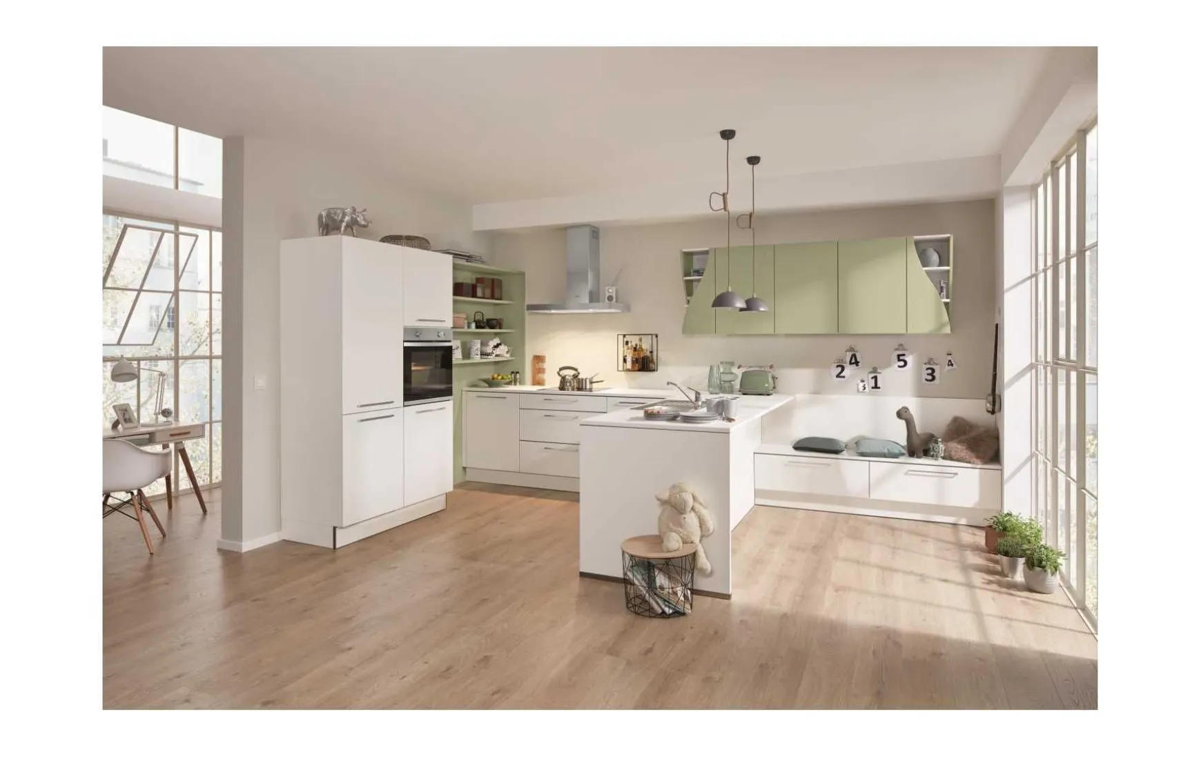 Elegante Einbauküche mit Bankelement in weiß softmatt kombiniert mit Hängern und topmodernen Regalen in Avocado softmatt, ca. 270+292×250+165cm. Elektrogeräte, Einbauspüle und Armatur gegen Mehrpreis. Andere Größen und Zusammenstellungen zum individuellen Preis planbar.