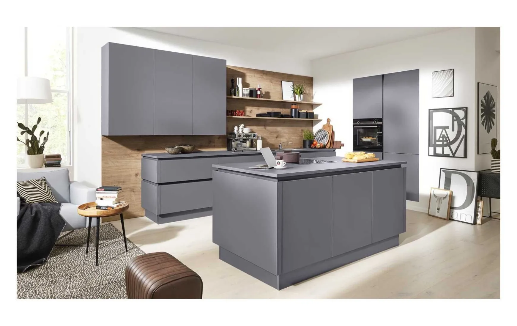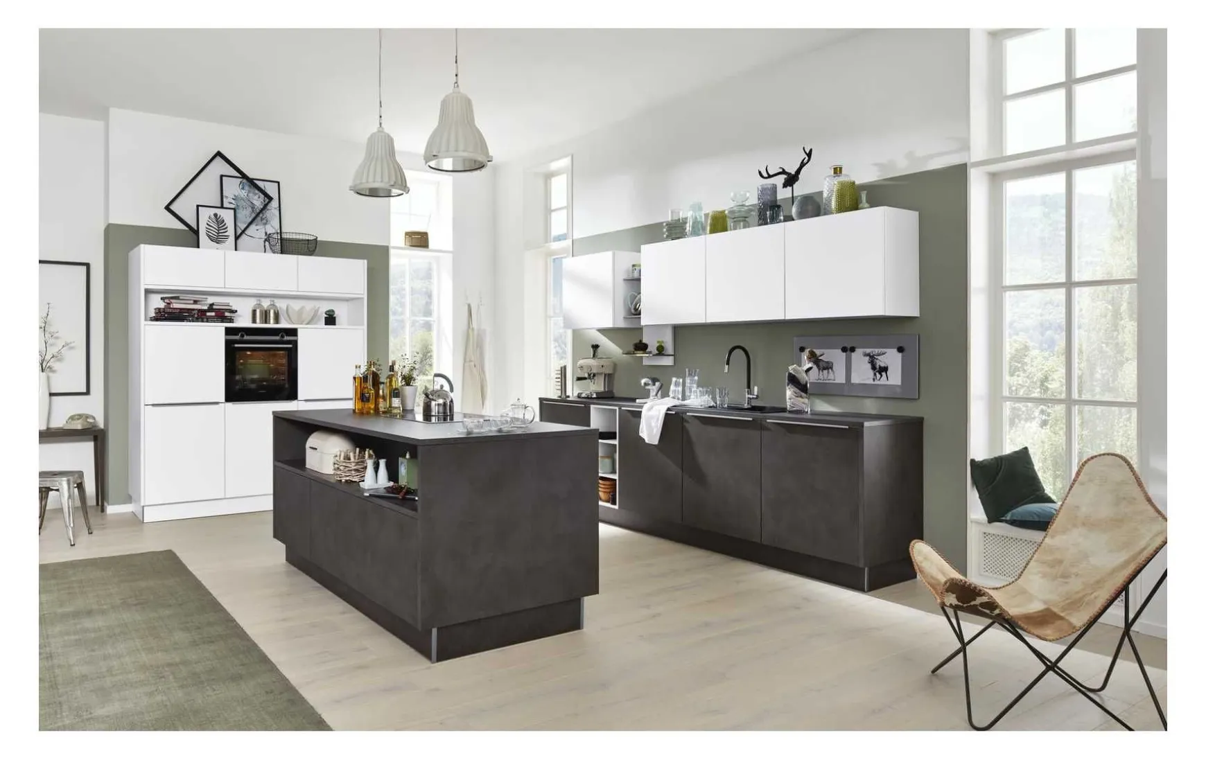 Topmoderne Einbauküche in Zement matt Anthrazit kombiniert mit Demielement und Hänger mit Regalelementen in weiss softmatt, ca. 275+185+185cm. Elektrogeräte, Sessel, Einbauspüle und Armatur gegen Mehrepreis. Andere Größen und Zusammenstellungen zum individuellen Preis planbar.