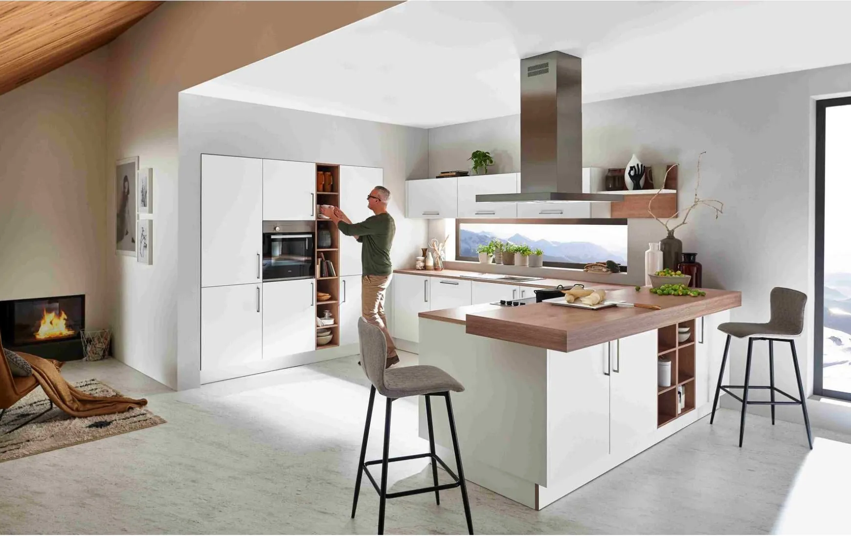 - Gegen Mehrpreis erhältlich: Geschirrspüler, Beleuchtung, Hocker und Armatur