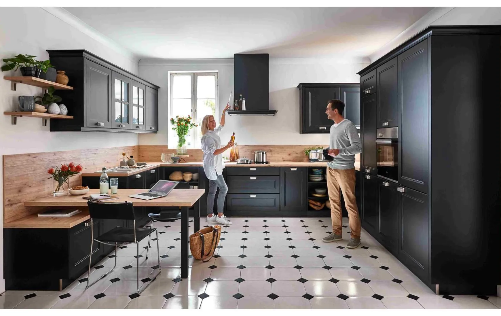 Moderne Landhausküche in Echtlack schwarz softmatt mit Arbeitsplatte, Frühstückstisch und Nischenverkleidung in Wildeiche rustikal Nachbildung ca. 312 x 430 x 315 cm inkl. Elektrogeräte-Set und Einbauspüle. Geschirrspüler, Stühle und Armatur gegen Mehrpreis. Andere Größen, Farben und Zusammenstellungen zum individuellen Preis planbar.