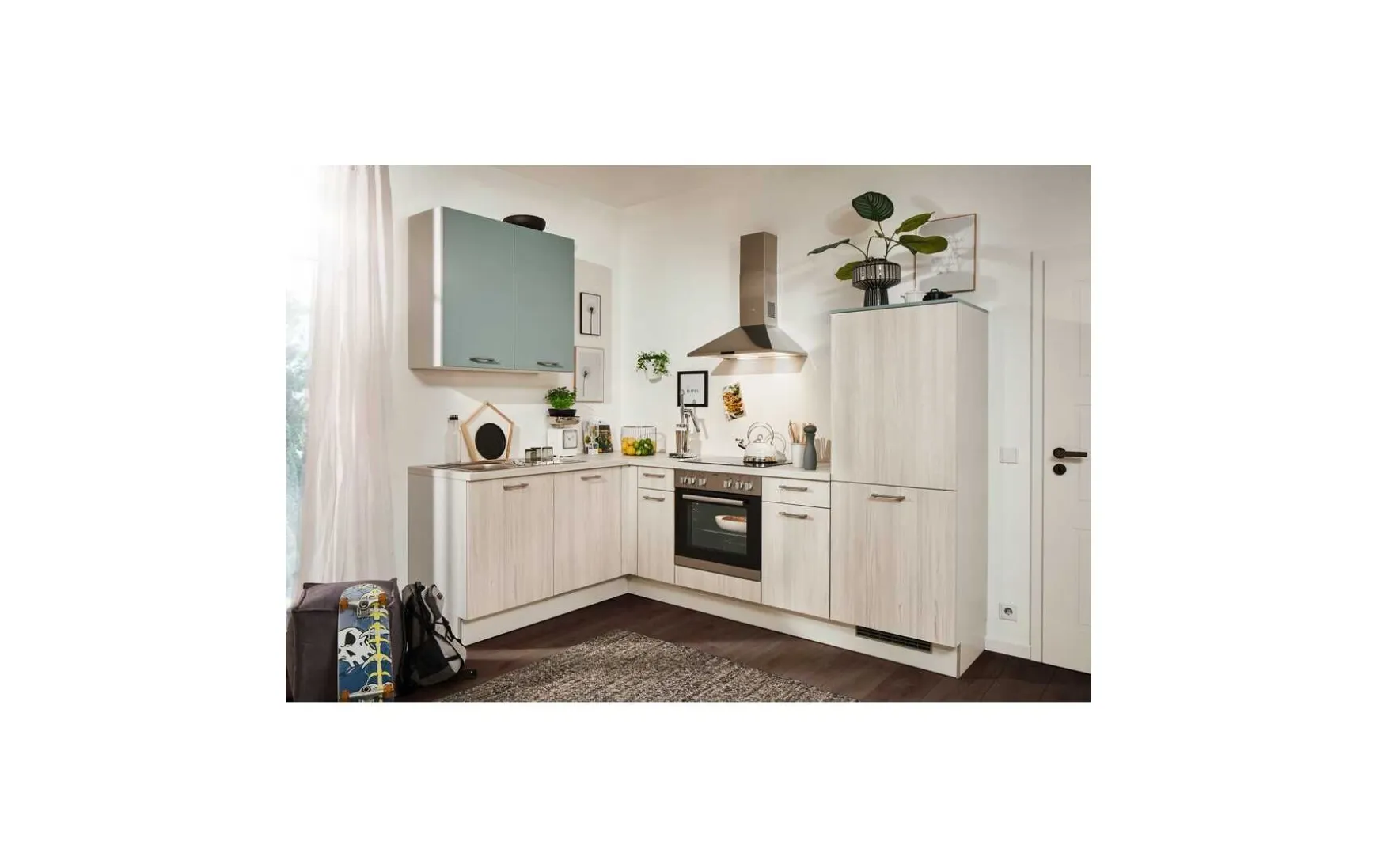 Topmoderne Winkelküche in Tanne cara Nachbildung kombiniert mit trendigem fjordgrün, ca. 185x255cm, inkl. Elektrogeräte-Set. Geschirrspüler, Einbauspüle und Armatur gegen Mehrpreis. Andere Größen und Zusammenstellungen zum individuellen Preis planbar.