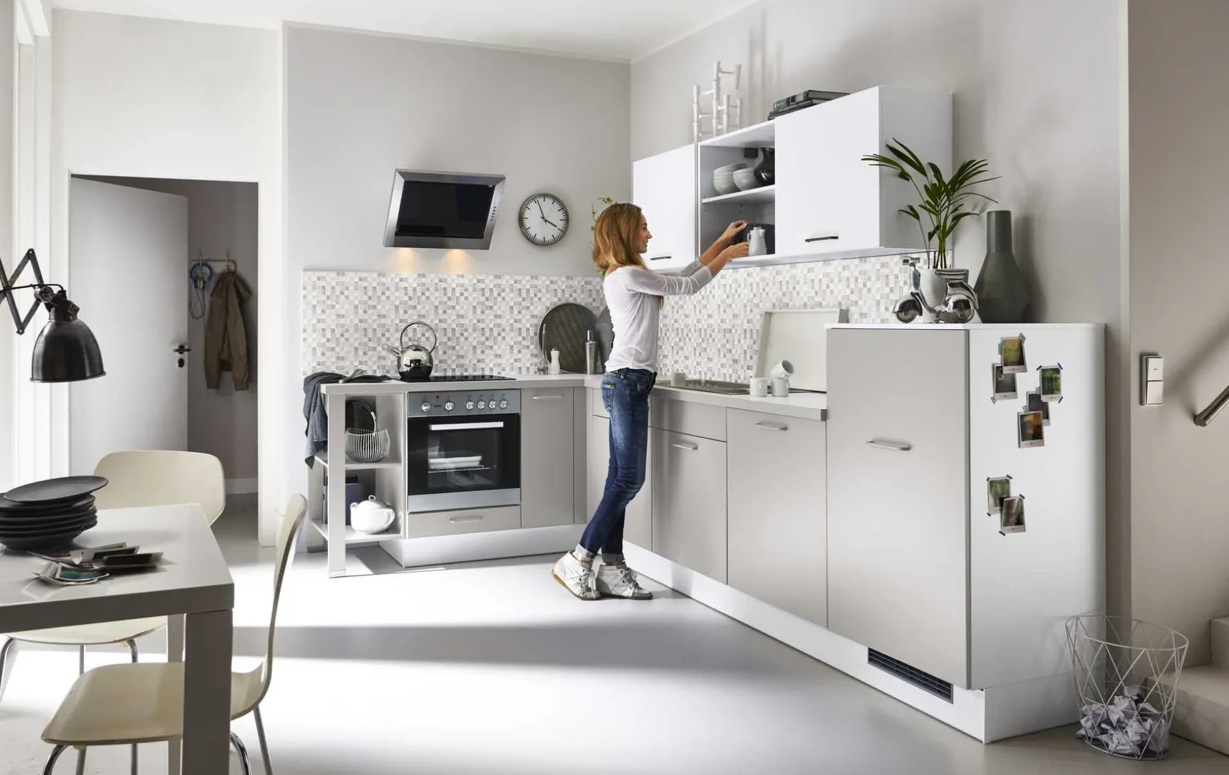 Topmoderne Einbauküche in weiß kombiniert mit Fronten in Platingrau, ca.193x305cm, ink. Elektrogeräte-Set und Einbauspüle. Geschirrspüler, Nischenrückwand, Essgruppe und Armatur gegen Mehrpreis erhältlich.Andere Größen und Zusammenstellungen zum individuellen Preis planbar.