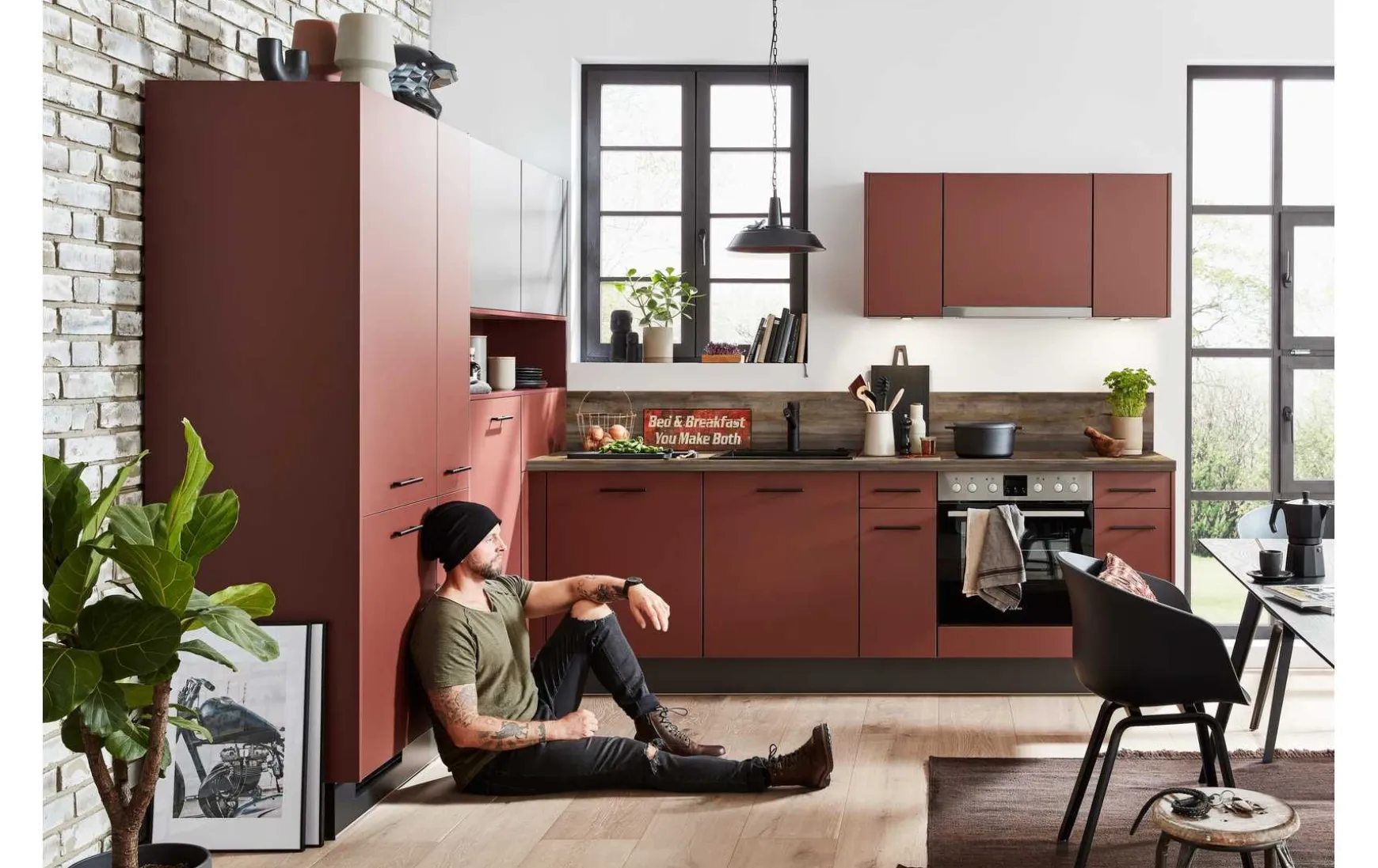 Topmoderne Einbauküche in Grafit kombiniert mit Fronten in Cranberry, ca.220x307cm. Elektrogeräte, Essgrupper Spüle und Armatur gegen Mehrpreis erhältlich. Andere Größen und Zusammenstellungen zum individuellen Preis planbar.