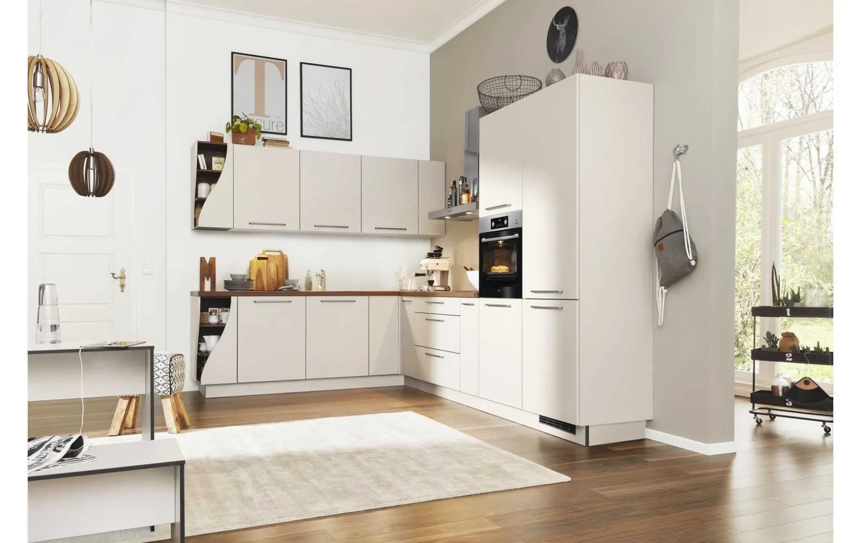 Moderne Einbauküche in Sahara softmatt kombiniert mit Arbeitsplatte und Regalelemente in Nussbaum Royal Nachbildung, ca. 242x335cm. Eletrogeräte, Einbauspüle und Armatur gegen Mehrpreis. Andere Größen und Zusammenstellungen zum individuellen Preis planbar.