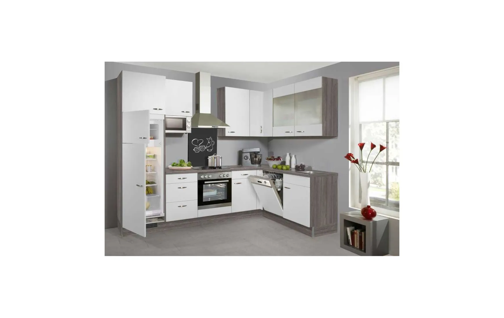 Topmoderne Einbauküche in Steineiche Nachbildung kombiniert mit Fronten in lichtgrau, ca. 285x185cm, inkl. Elektrogeräte-Set. Geschirrspüler, Einbauspüle und Armatur gegen Mehrpreis. Andere Größen und Zusammenstellungen zum individuellen Preis planbar.