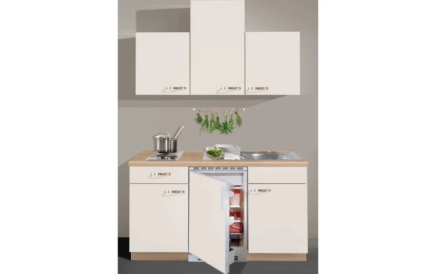 Moderne Einbauküche in Sonoma Eiche Nachbildung kombiniert mit magnolienweiß, ca.150cm inkl.Kochfeld und Kühlgerät. Armatur gegen Mehrpreis erhältlich. Andere Größen und Zusammenstellungen zum individuellen Preis planbar.