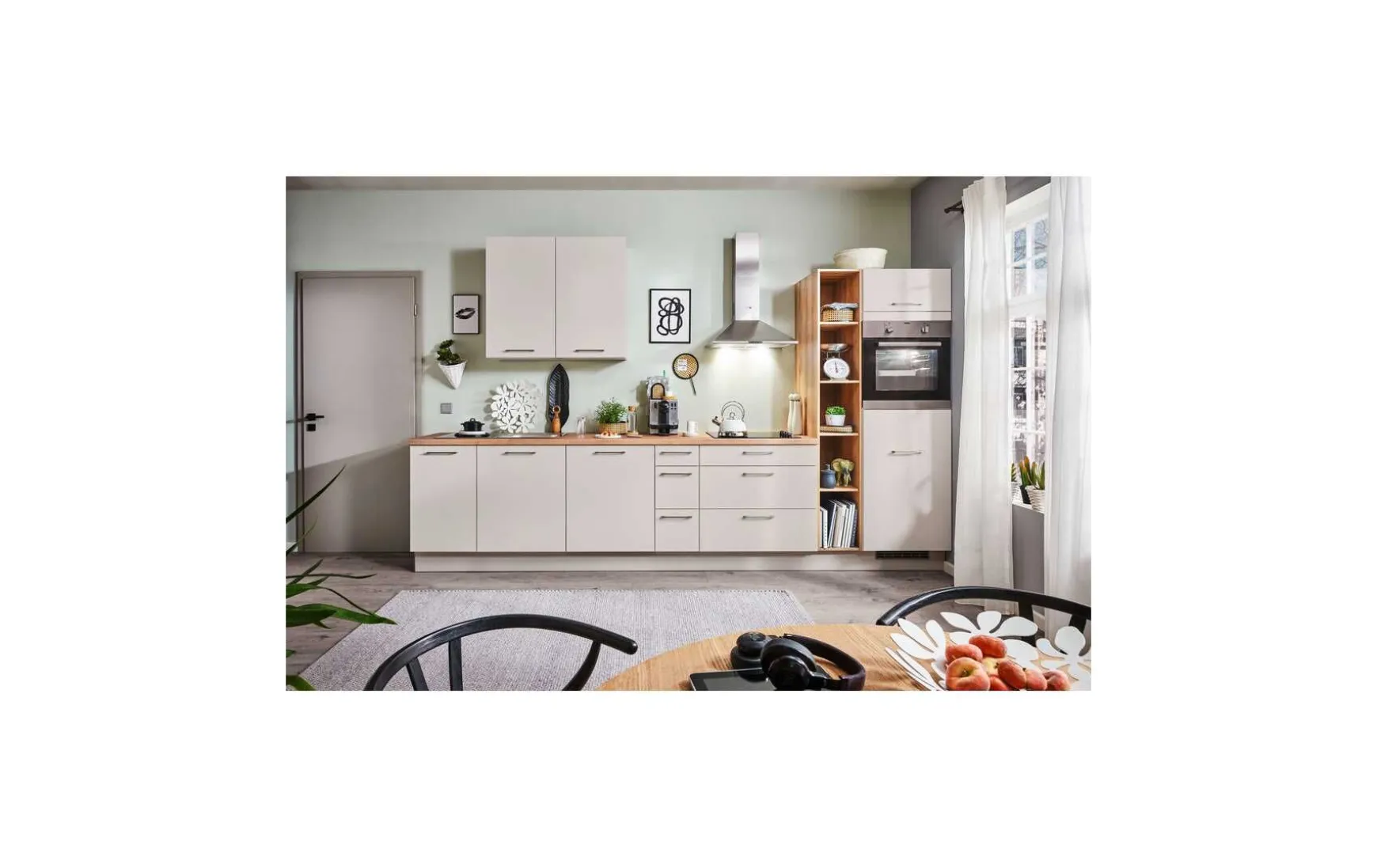 Moderne Einbauküche in kaschmirgrau kombiniert mit Arbeitsplatte und Regalelement in Honig Eiche Nachbildung, ca. 365 cm, Inkl. Elektrogeräte-Set. Geschirrspüler, Einbauspüle und Armatur gegen Mehrpreis. Andere Größen und Zusammenstellungen zum individuellen Preis planbar.