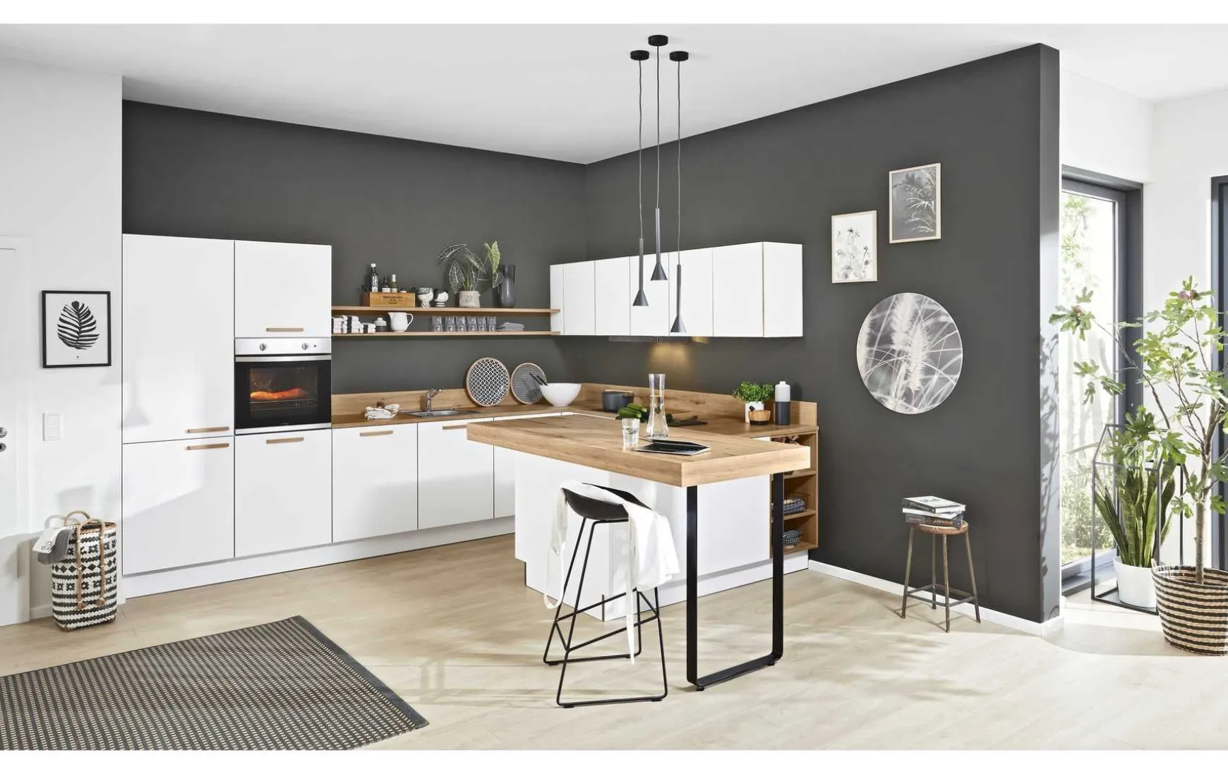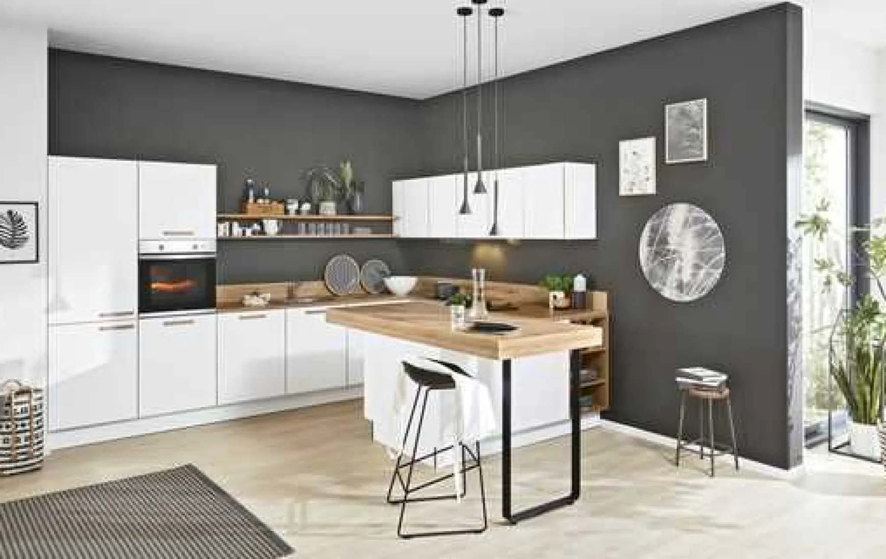 Moderne Einbauküche in weiß Softmatt kombiniert mit Arbeitsplatte und Ansatztisch in Vulkaneiche Nachbildung, ca. 365 x 258 x 200 cm. Elektrogeräte, Hocker, Einbauspüle und Armatur gegen Mehrpreis. Andere Größen und Zusammenstellungen zum individuellen Preis planbar.