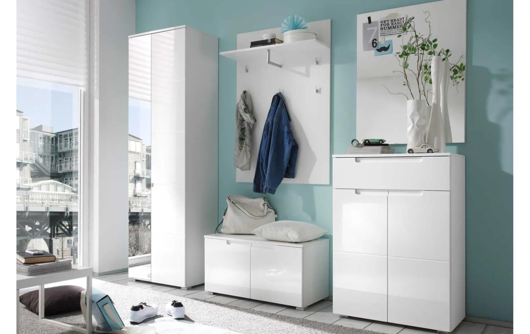 Die 5-teilige Garderobenserie in Weiß Hochglanz bringt Stil und Ordnung in jeden Eingangsbereich. Mit ihren modernen, grifflosen Fronten schafft sie ein harmonisches und einladendes Ambiente, das nicht nur Gäste, sondern auch die Bewohner selbst willkommen heißt. Das Set besteht aus einem Hochschrank mit Spiegeltür und ausziehbarer Kleiderstange für Jacken und Mäntel, einem Wandpaneel mit Haken für zusätzliche Aufhängemöglichkeiten, einer 2-türigen Schuhbank, einer hohen Schuhkommode sowie einem großen Spiegel. Mit den Maßen von ca. 60 × 198 × 40 cm (Hochschrank), 80 × 117 × 24 cm (Wandpaneel) und 70 × 101 × 40 cm (Schuhkommode) bietet die Garderobe viel Stauraum für Schuhe, Jacken und Accessoires, während der Spiegel den Raum optisch vergrößert. So vereint das Set praktische Funktionalität und modernes Design in einem stilvollen Eingangsbereich.