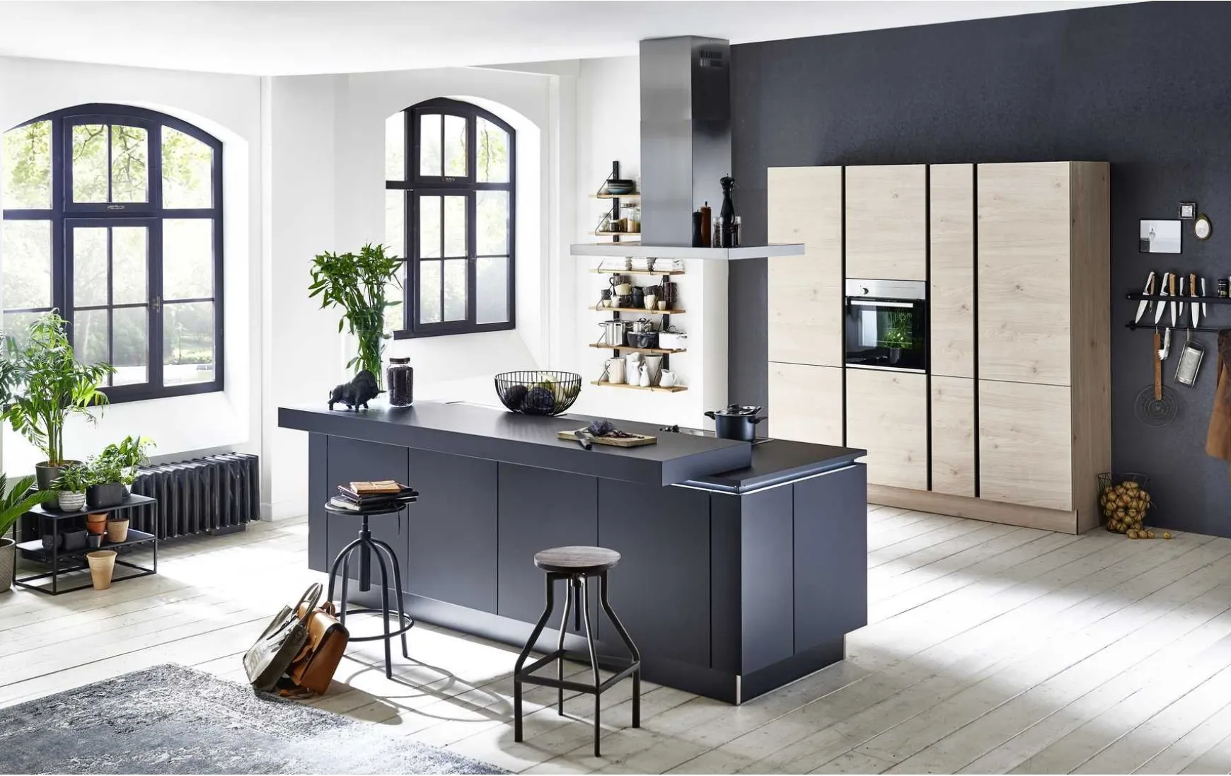 Die Highboards in Asteiche natur Nachbildung beherbergen den Kühlschrank und den ergonomisch hochgestellten Backofen. Zusätzlich sorgt ein Vorrats- Geschirrschrank für den nötigen Stauraum, um Ihre Küche immer aufgeräumt zu halten. Als starken Kontrast dient die Insel, die komplett in Schwarz designed wurde. Einen eleganten Abschluss bilden die Insel- Unterschränke mit Drehtür. Als Zentraler Punkt der Küche dient die aufgesetzte Barplatte, die Platz für Barhocker bietet. Dieser Platz kann zum Essen, Arbeiten oder zum verweilen verwendet werden. Eine Vielzahl an inkludierten Elektrogeräten rundet dieses Küchenangebot ab.