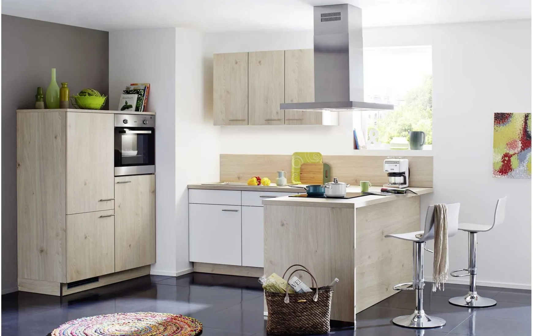 - Weitere Angaben: Spüle Edelstahl, Nischenrückwand in Madeira Eiche Hell Nachbildung