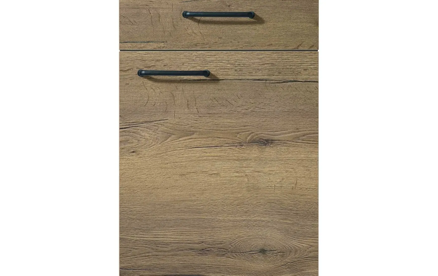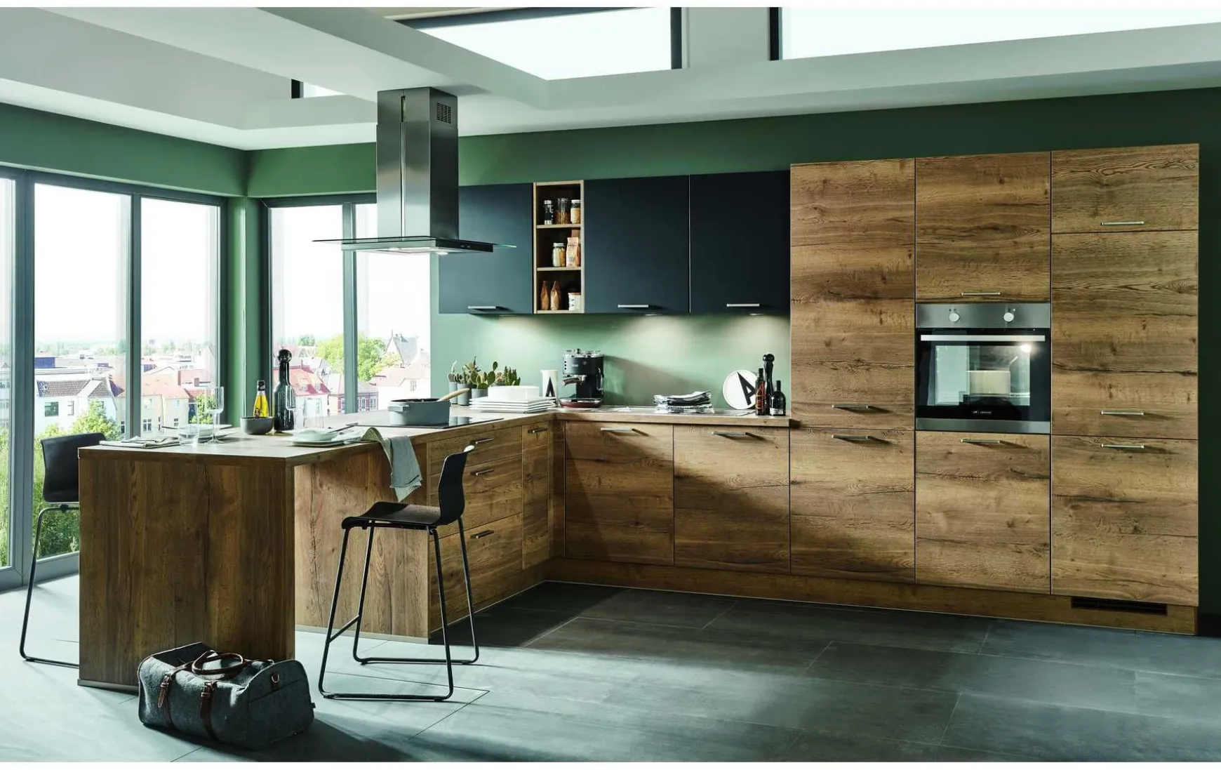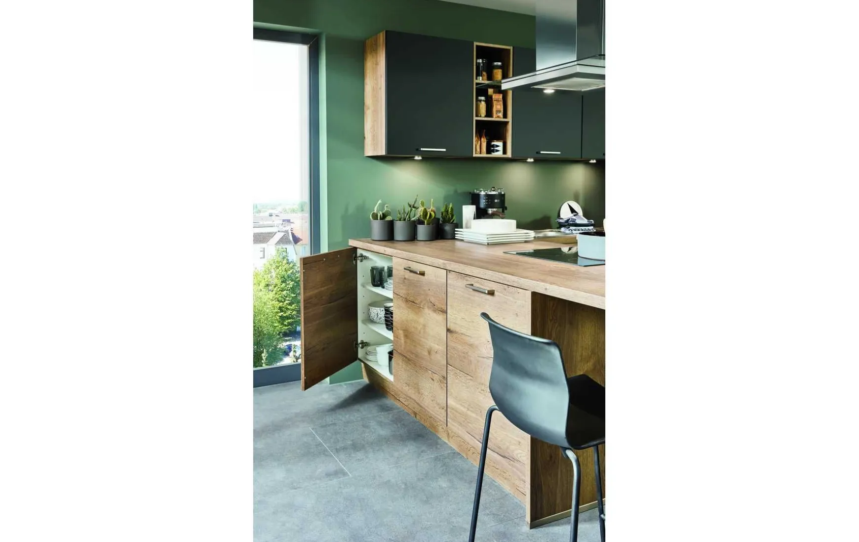 Geradliniges Design mit vielen modernen Details trifft auf natürliche Holzmaserung. Das stilvolle Küchendesign verfügt über einen geräumigen und voll funktionsfähigen Seitenschrank, eine erweiterte Arbeitsplatte und wunderschön gestaltete Oberschränke. Mit Ausnahme der Vorderseite der Schrankwand besteht die Küche vollständig aus Eiche Havana Nachbildung. Die Vorderseite der Oberschränke ist in schwarz matt hervorgehoben und bildet einen scharfen Kontrast zu dem warmen Holzton. Das hölzerne Mittelregal lockert das Erscheinungsbild der oberen Küchenelemente auf. Als Premium-Küche punktet Ihre neue Küche nicht nur optisch, sondern auch funktional. Eine umfassende Ausstattung mit Elektrogeräten ist selbstverständlich. Der ergonomische Backofen und Kühlschrank sorgen für besonderen Komfort im täglichen Leben. Die geräumigen Schubladen und Schränke bieten genügend Stauraum. Die erweiterte Arbeitsfläche bietet Platz für zwei Stühle und eignet sich somit sehr gut als Lösung für den Essbereich.
