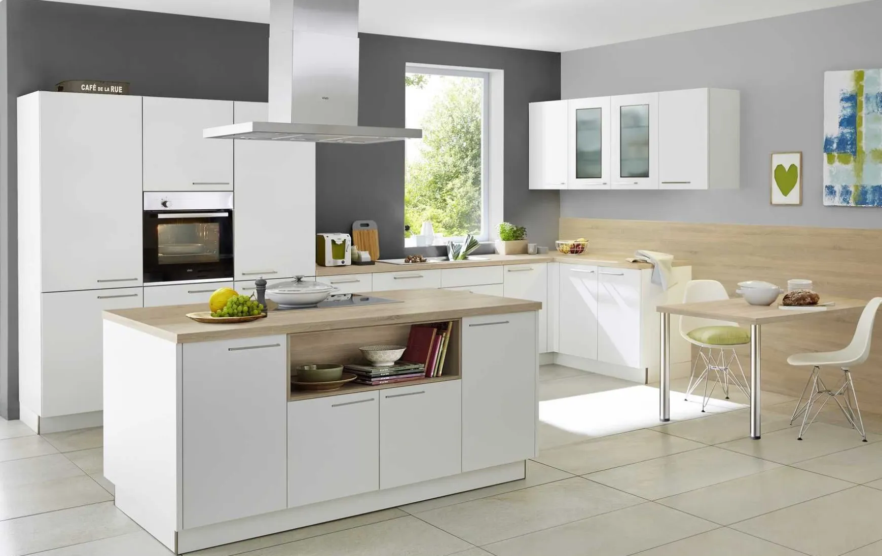 Die Inselküche ist in mattem Weiß gehalten. Abgerundet wird das Erscheinungsbild durch einen Metallgriff in Edelstahloptik. Um einen harmonischen Kontrast herbeizuführen, wurde die Arbeitsplatte in einer optisch ansprechenden Kansas Oak Sägerau-Optik gewählt. Dank der kratzfesten und pflegeleichten Melaminharzbeschichtung sind die Fronten den Herausforderungen des turbulenten Familienlebens gewachsen.