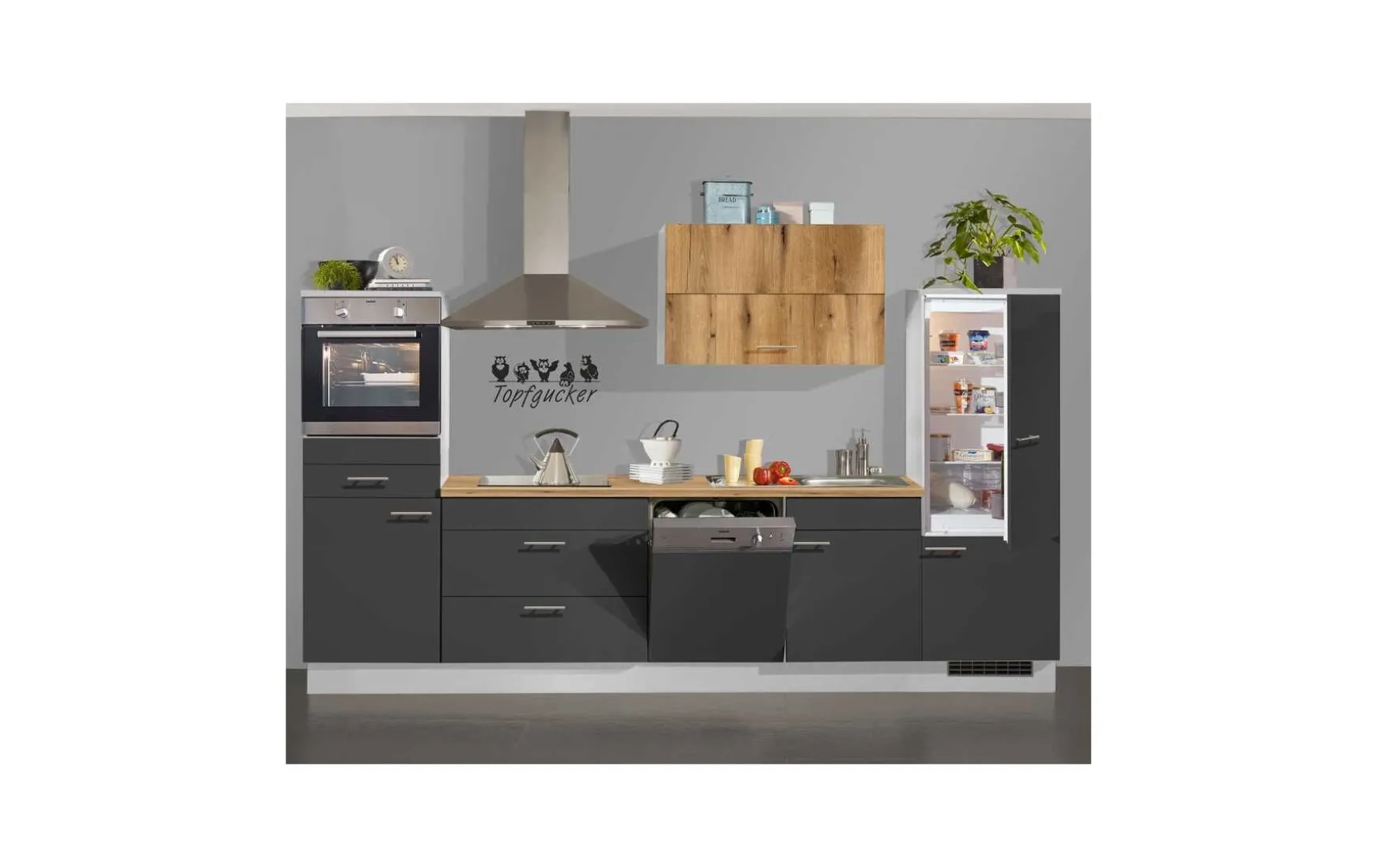 Topmoderne Einbauküche in lichtgrau kombiniert mit Fronten in grafit und Arbeitsplatte und Hänger in Evoke Eiche Nachbildung, ca. 330cm inkl. Elektrogeräte-Set. Geschirrspüler, Einbauspüle und Armatur gegen Mehrpreis. Andere Größen und Zusammenstellungen zum individuellen Preis planbar.