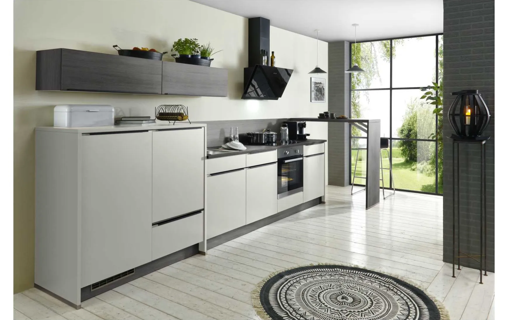 Topmoderne Einbauküche in Lacklaminat hellgrau matt kombiniert mit schwarz Steinstruktur, ca. 415 cm, inkl. Elektrogeräte-Set und Einbauspüle. Geschirrspüler, Hocker und Armatur gegen Mehrpreis erhältlich. Andere Größen und Zusammenstellungen zum individuellen Preis planbar.