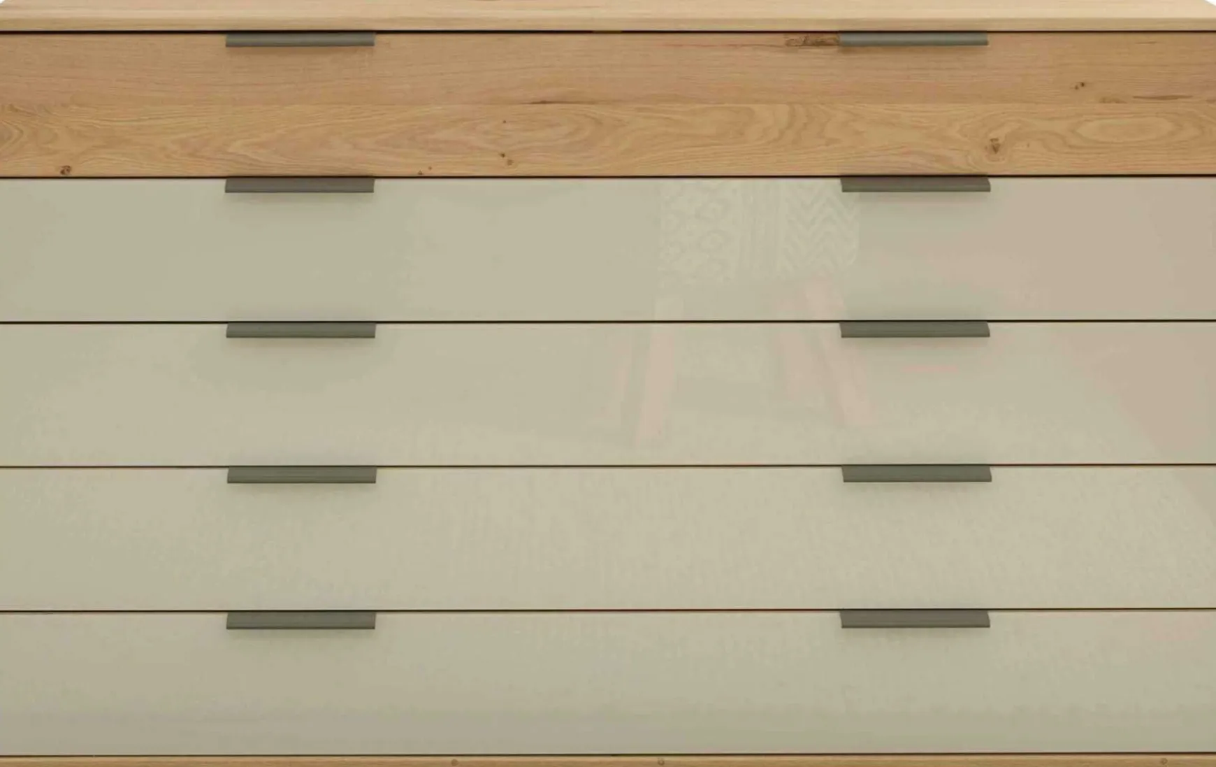Die Schubladenkommode aus der hochwertigen Serie kombiniert champagnerfarbene Glasfronten mit einem Korpus in biancofarbener Eiche-Nachbildung. Einen gelungenen Akzent setzt die oberste Schubladenfront in biancofarbenem Eiche-Massivholz. Schieferfarbene Metallgriffe und die Innengestaltung in Erle-Nachbildung runden das modern-elegante Design harmonisch ab. In den fünf geräumigen Schubladen haben Sie viel Stauraum und bringen Sie einiges unter. Zudem können Sie den Oberboden als Ablage für Deko nutzen. Die Maße der Schubkastenkommode belaufen sich auf ca. 141 x 86 x 43 cm (BxHxT).
