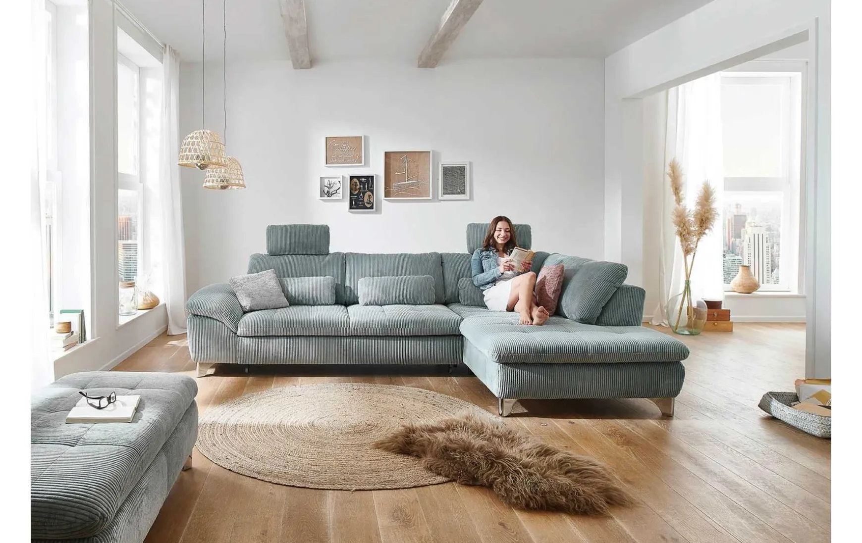 Diese Polsterecke im jungen und trendigen Lounge-Design, mit topaktuellem Cordbezug blau, Rücken echt. Perfekt zum Sitzen und Relaxen, das Stellmaß beträgt ca. 306 x 197 cm.