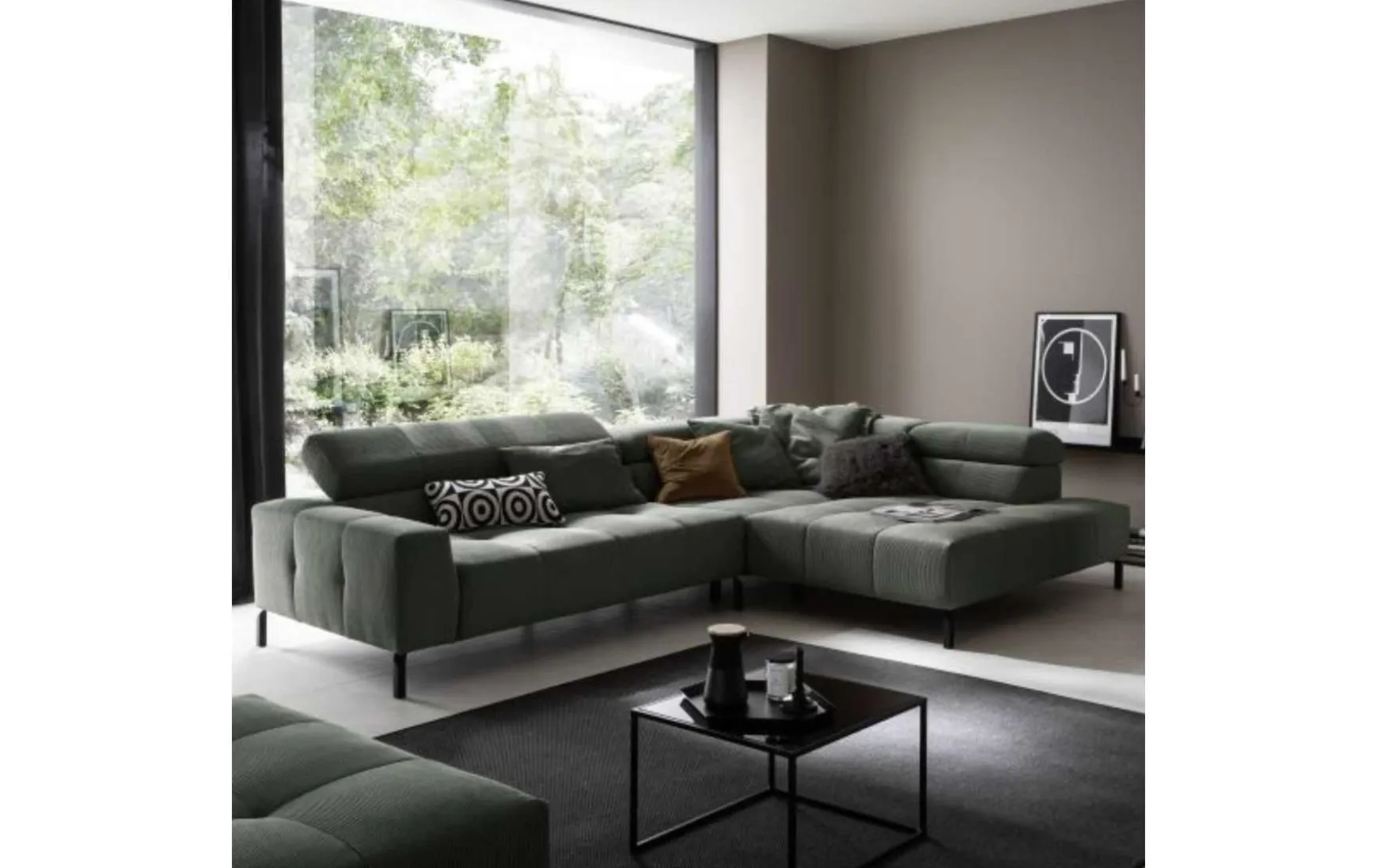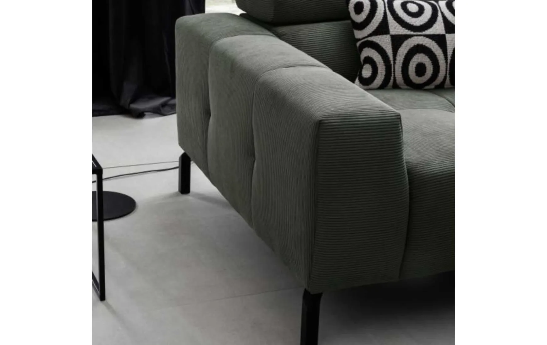 Diese moderne Polsterecke vereint stilvolles Design mit durchdachtem Komfort. Der hochwertige Feincord-Bezug im eleganten Farbton Olive verleiht dem Sofa eine trendbewusste, wohnliche Ausstrahlung und macht es zum Blickfang im Wohnzimmer. Die schwarzen Metallfüße unterstreichen den modernen Charakter und sorgen für einen stabilen Stand. Für maximalen Komfort verfügt die Polsterecke über eine praktische Kopfteilverstellung, die individuell angepasst werden kann. Der manuelle Sitzvorzug ermöglicht es zudem, die Sitzfläche im Handumdrehen zu erweitern – ideal für entspannte Abende oder gemütliche Stunden mit Familie und Freunden. Der komfortable Sandwichaufbau im Sitz sorgt für eine ausgewogene Kombination aus Stabilität und Bequemlichkeit. Mit der Armlehne auf der rechten Seite eignet sich das Sofa perfekt für moderne Wohnkonzepte und offene Raumgestaltungen.