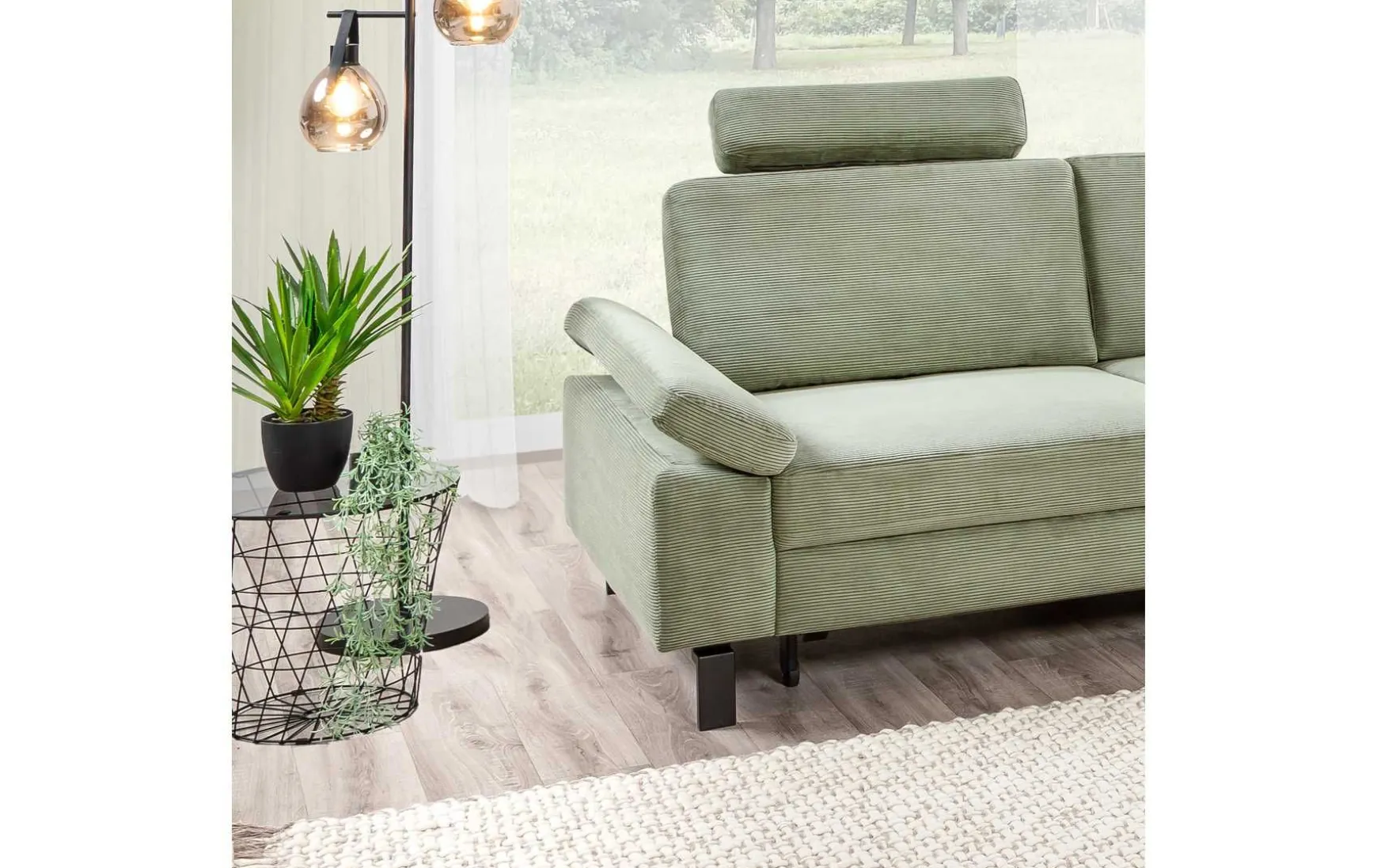 Das charmante Kolorit in Olivgrün verleiht dem Polstermöbel eine harmonische Optik und fügt sich schick in verschiedene Einrichtungstrends ein. Das Design wird durch die hohen Winkelfüße aus mattem Eisen in Schwarz stilgerecht vervollständigt, welche leichte Bodenfreiheit schaffen.