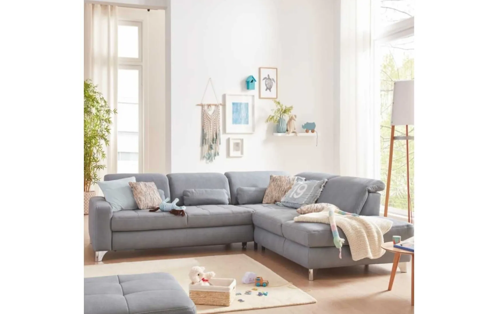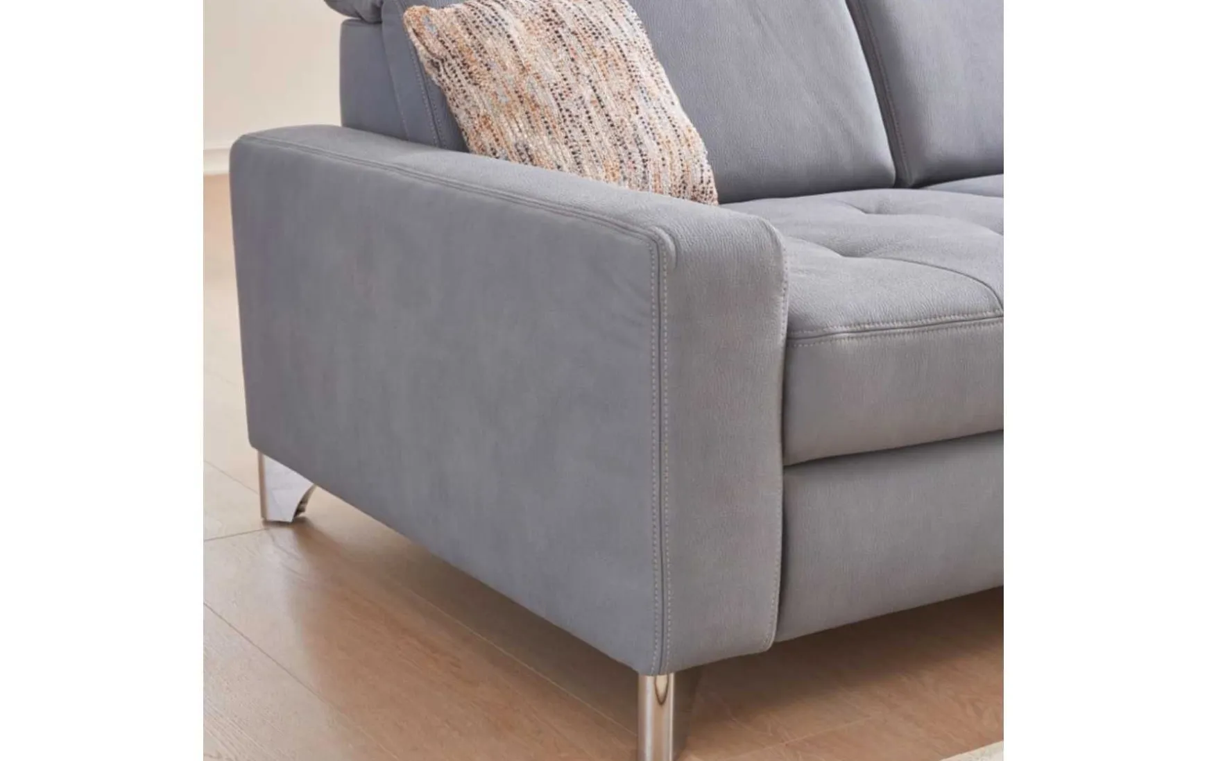 Diese Wohnlandschaft mit einem Taschenfederkernsitz auf einem Bonell-Federkern, ummantelt mit hochwertigem Polyätherschaum. Der Stoffbezug in Mammut Steel ist hochwertig verarbeitet und besonders pflegeleicht. Glänzende Metallfüße verleihen der Wohnlandschaft ausreichend Stabilität. Die Wohnlandschaft besteht aus einem 3-Sitzer, einer Spitzecke und einem 1,5-Sitzer mit einem Anstellhocker auf der rechten Seite.
