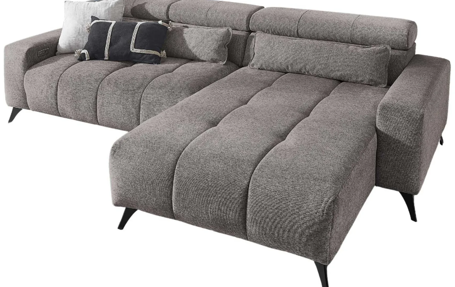 Die moderne Polsterecke in Maloy-Grau verbindet stilvolles Design mit hohem Komfort und vielseitiger Funktionalität. Die Ottomane links ist mit einer elektrischen Sitztiefenverstellung um ca. 60 cm ausgestattet, sodass Sie die Sitzfläche individuell anpassen können. Dank der Schlaffunktion lässt sich die Polsterecke in eine großzügige Liegefläche von ca. 221 × 127 cm (L × B) verwandeln. Mit einer Gesamtbreite von 265 cm und einem Schenkelmaß von 180 cm bietet das Sofa ausreichend Platz für entspannte Stunden. Der Sitzkomfort wird durch Polyätherschaum auf Nosagunterfederung gewährleistet, während die metallischen Füße in Schwarz einen modernen Akzent setzen. Der hochwertige Stoffbezug in Maloy-Grau sorgt für eine angenehme Haptik und pflegeleichte Handhabung.